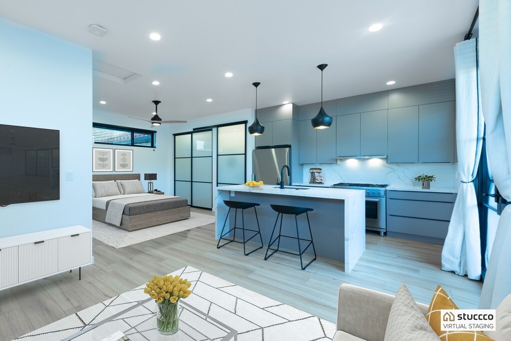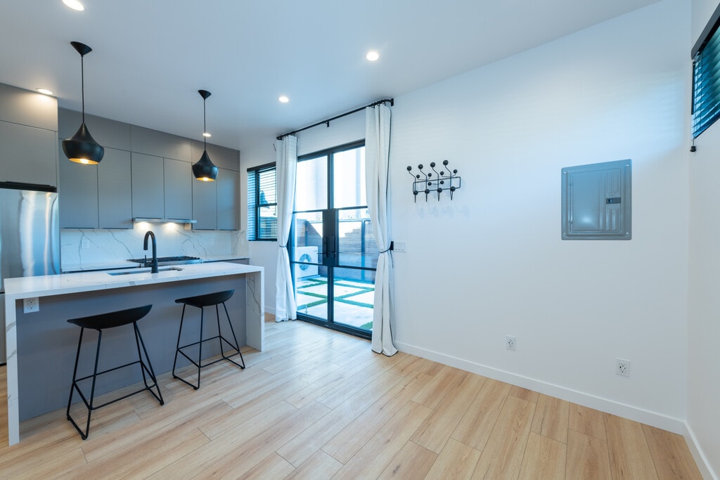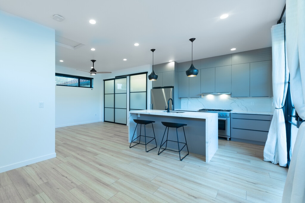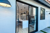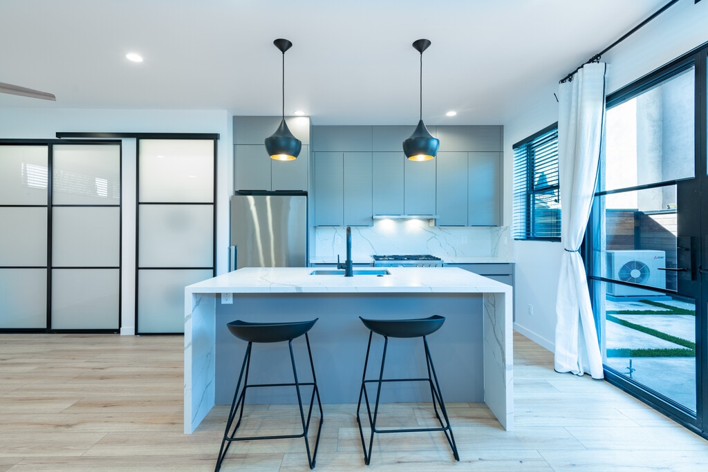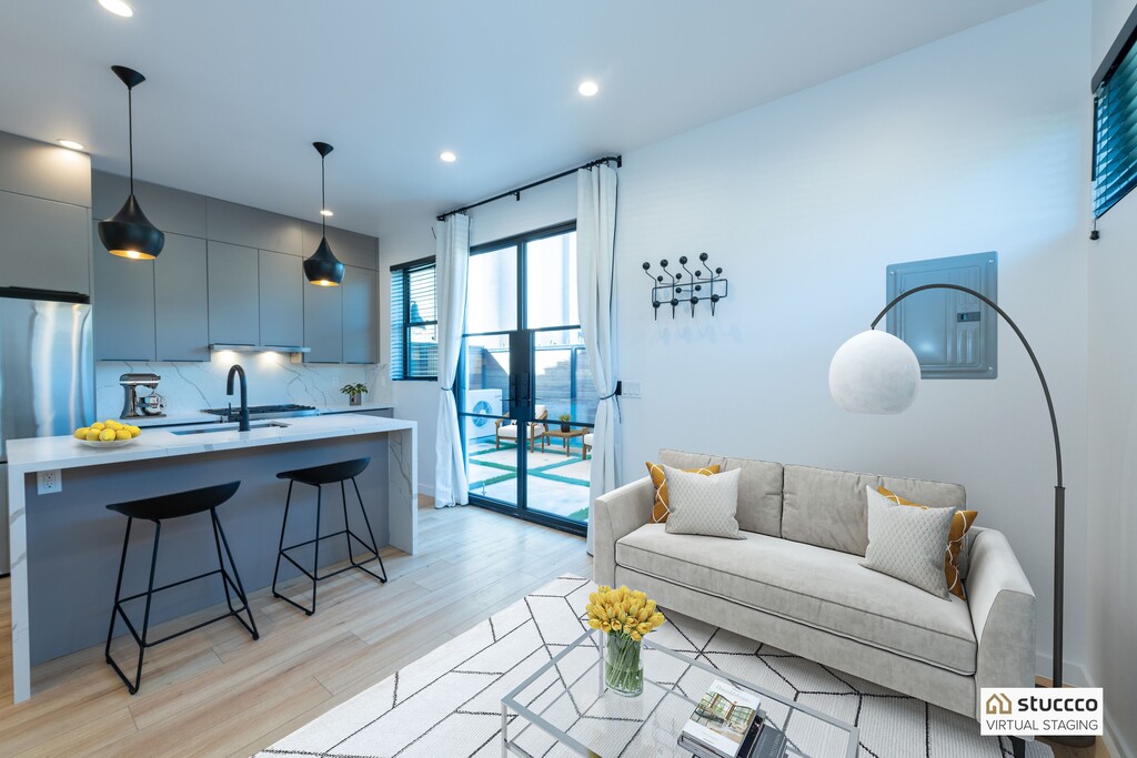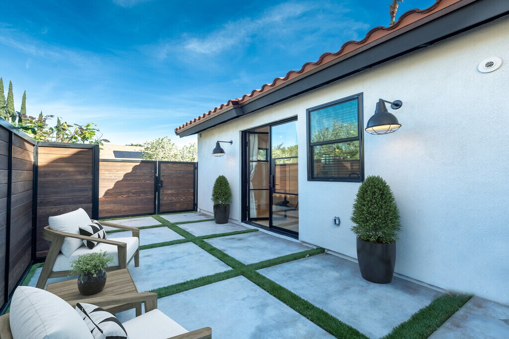 Welcome to a modern and beautifully designed studio ADU located on a quiet cul-de-sac in desirable Northridge, Los Angeles. This contemporary space combines thoughtful design, premium finishes, and everyday convenience in one exceptional rental. All utilities are included, offering a simple and predictable living experience. The studio features a custom European-style kitchen equipped with premium Italian and German appliances ideal for anyone who appreciates quality and efficiency. Inside, you’ll find soaring 9-foot ceilings and abundant windows that flood the space with natural light, creating an open and airy feel. Step outside to your private modern patio perfect for relaxing, working remotely, or enjoying Southern California evenings. The private street setting offers ample parking and a welcome sense of privacy. The bathroom includes a luxurious rain shower, and the unit is fully climate-controlled with both air conditioning and heating for year-round comfort. Located less than five minutes from California State University, Northridge, this studio is ideal for professionals, graduate students, or anyone seeking a stylish, low-maintenance living space in a prime location. Note: Furniture is not included and is virtually staged for inspiration only. Two counter stools are included.