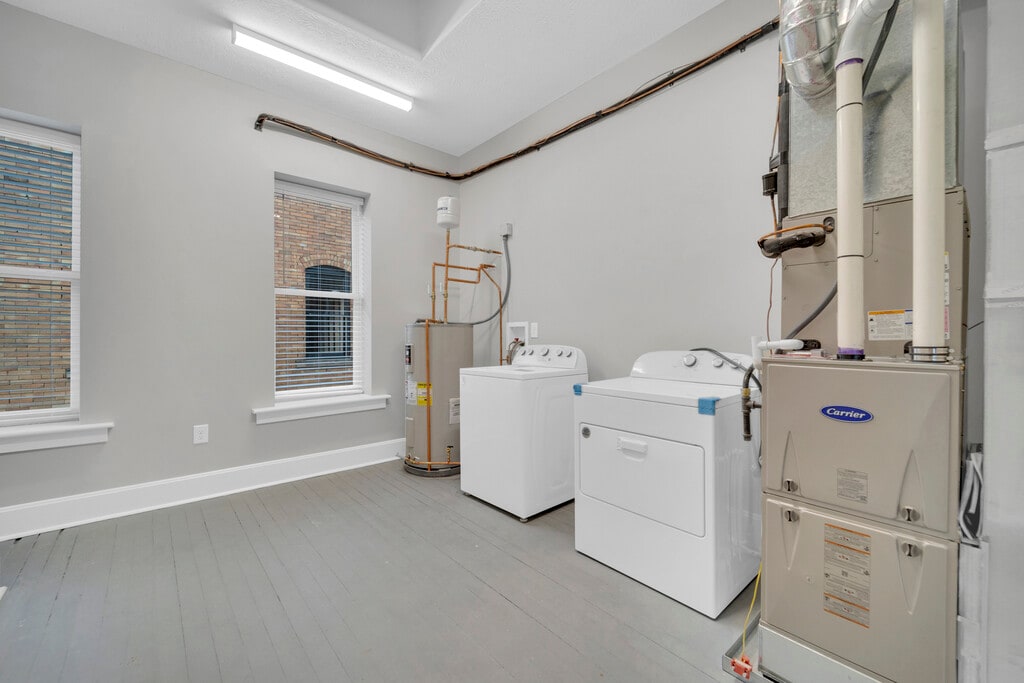 Unit 17-B occupies the entire 3rd floor of a 3-story brick building. Approximately 1,750 square feet, executive quality, complete renovation, spacious open floor plan, walk to restaurants, concert venues, museums, farmer's market as well as other attractions and services. High efficiency heating and cooling units, large ample closets and utility room. Plenty of natural light with windows on three sides of unit, includes 2-inch faux wood blinds on all windows. Wide window sills, exposed brick wall elements in several living areas. Quartz countertops in kitchen and baths. Reserved parking space in adjacent lot. Refuse and water included.