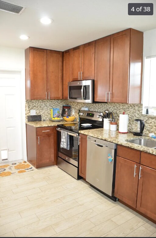 *Not in a flood zone* Gorgeous 3/2 single family home featuring updated appliances and lots of natural light. Totaling 1,550 sq ft, the house boasts luxury tile in the common areas and carpet in each bedroom. The oversized en-suite bedroom is located at one end of the house and contains two walk-in closets and an enormous shower. The remaining two bedrooms are nicely sized and have large closets. Each bedroom has a ceiling fan and light combo. Keypad entry on the front door makes for easy accessibility. The windows are new and double-paned, eliminating outside noise and expertly keeping in the cool air! The house was renovated in 2016, and has been immaculately cared for since. It sits on a large corner lot on a cul-de-sac in the Woodlawn Oaks area. Across the street are sand volleyball courts, softball fields, and a playground. The house is located mere blocks from Woodlawn Elementary, restaurants, and shopping. Downtown St. Pete is just a 10 minute bike ride away! The property is east-west facing. Have your breakfast watching the sunrise over the volleyball courts, then enjoy sunset in the shade on the back patio. Property also contains a large shed perfect for your bicycle storage needs and mature, low-maintenance landscaping in both the front and back yards. Gardeners, you'll love the mango tree, banana trees, basil, and grape tomato plants, all of which produce in abundance! The backyard is fully fenced with gated access and features a stone patio and a fire pit. The shell driveway can easily accommodate your boat or up to 4 cars. On-street parking is available with no permit or time limits. We love pets and welcome them on a case-by-case basis! The rental price is $2750/month. Rent includes quarterly pest control service, annual AC servicing, and weekly/bi-weekly (depending on time of year) lawn maintenance. Tenants pay for utilities including water/sewer, electric, and internet. To move in, one month's rent, a security deposit of $2750, rental insurance, and a background check are required. We're experienced landlords who are highly responsive and live locally, you won't regret renting from us! Notes: the two-in-one washer/dryer will be replaced by separate washing machine and dryer prior to tenant move-in.