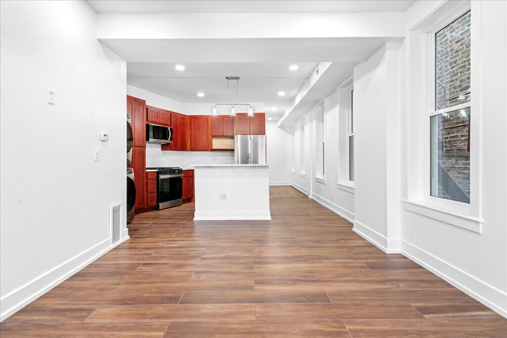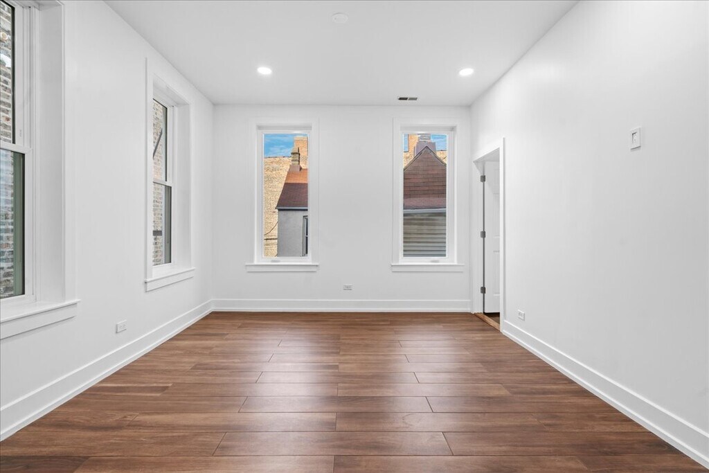 Beautifully Remodeled 2-Bedroom + Office Apartment in the Heart of Pilsen. The home features 9+ foot ceilings and large, brand-new energy-efficient windows that bring in exceptional natural light. The modern kitchen is equipped with brand-new stainless steel appliances, including a refrigerator, gas range, microwave, dishwasher, and in-unit washer and dryer. Quartz countertops and cherry cabinets provide both style and functionality. The layout includes two bedrooms, one full bathroom, and an additional private room that works perfectly as a home office, study, or hobby space. The fully remodeled bathroom features elegant tile flooring, a floating vanity, and a glass-enclosed shower with a modern showerhead. This spacious, second-floor apartment has been thoughtfully updated. *Additional features include: *Central air conditioning and heat *Original natural wood floors paired with ceramic tile *Updated lighting throughout Located in Pilsen, this home offers convenient access to public transportation and major expressways. The CTA #60 bus and Pink Line are nearby, providing quick connections to UIC, the Medical District, downtown Chicago, and surrounding neighborhoods. Easy access to I-290, I-55, and I-90 makes commuting simple. This property combines modern comfort, efficiency, and style in a vibrant, centrally located community.
