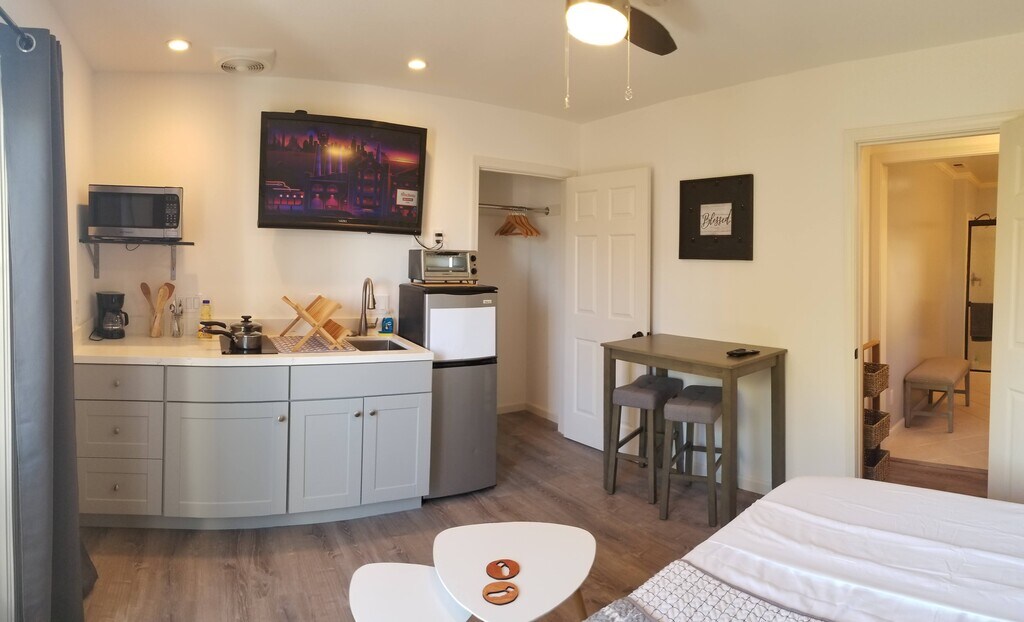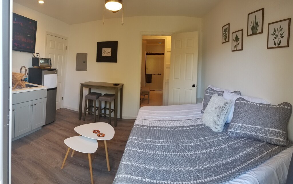 This cozy and private second-story studio is an attached unit to the main house, located on a peaceful cul-de-sac. Situated above the garage, the unit features a private entry with its own exterior stairwell, which is exclusively used by the studio tenant and offers a strong sense of separation and privacy from the main home. Inside, the studio is bright and sunny, thanks to French glass doors that open to a private balcony with seating and tranquil, tree-lined views. Blackout curtains are also included for comfort and privacy. The space features a spacious bathroom with a large walk-in shower, a roomy vanity with built-in storage, and a compact kitchenette equipped with a two-burner cooktop, refrigerator, and microwave (no oven). The unit includes two closets—one hanging closet and one shelved closet—providing ample in-unit storage. Please note there is no additional storage available outside of the unit. The studio may be rented furnished or unfurnished. • If rented furnished, it comes exactly as shown in the photos. • If rented unfurnished, all furniture will be removed, with the TV, microwave, and refrigerator remaining. Comfort is provided year-round with window A/C and a baseboard heater. Laundry A free, shared front-load washer and dryer (stacked, newer machines) are located in the garage and may be used anytime. Laundry is shared with the main house, and schedules can be coordinated to avoid overlap. Parking Street parking is available directly in front of the home, with overnight parking guaranteed for one vehicle. Due to the limited space on the cul-de-sac, additional vehicles are welcome to visit but cannot park overnight. Location The studio is ideally located within walking distance to Walgreens, three grocery stores, Dollar Tree, and a variety of restaurants. A nearby bus stop provides easy access to public transit. Utilities & Lease Terms Utilities are simplified with a flat $175 monthly fee, covering water, sewer, garbage, PG&E, and high-speed Wi-Fi (approx. 229 Mbps download / 39 Mbps upload)—well-suited for remote work and streaming. Security deposit: $1,000 Section 8 is welcome. Pets may be considered on a case-by-case basis. Pet rent may apply (to be agreed at lease signing). Renters Insurance will be required. No inside smoking, outside smoking is ok. This studio is best suited for one quiet individual who values a peaceful living environment. While the unit is attached to the main house, it is designed to feel private and self-contained. Video walkthrough available upon request. About Us We live in the main home on the property and enjoy traveling both locally and abroad throughout the year. We value being friendly and responsive while fully respecting our tenant’s privacy and independence. If anything comes up during your stay, we’re prompt, attentive, and easy to reach.
