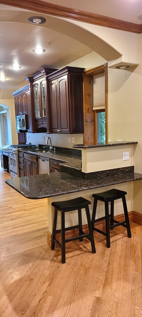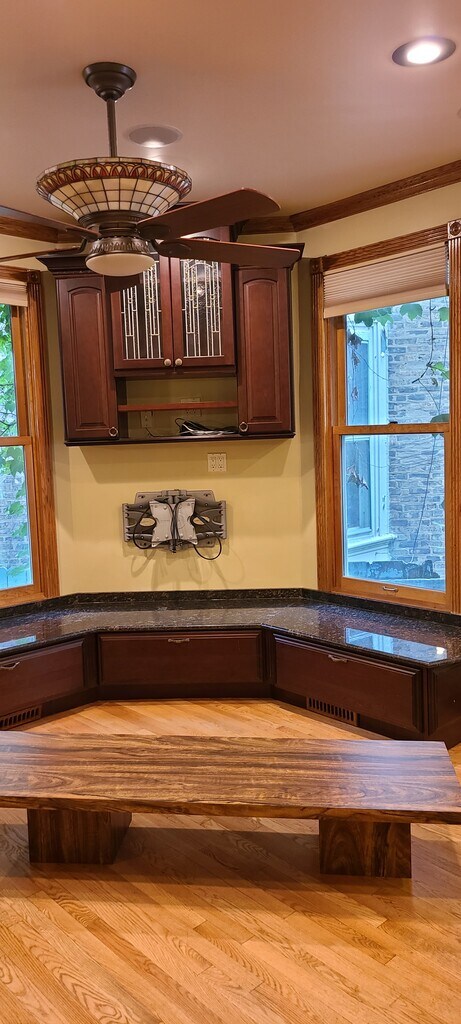 5 bedroom/3 bath duplex apartment; Gourmet kitchen with stainless-steel appliances, granite counter-tops, and custom cherry cabinetry. Luxurious bathrooms with surround shower systems, custom cherry cabinetry, marble tiling. Hardwood floors; 2 gas fireplaces; central heat/AC, ceiling fans; ample storage and beautiful built-in book cases and entertainment center. "Wet bar" on the lower level with granite counter tops, cherry cabinetry, microwave, and full-size refrigerator/freezer. Coin-op laundry in building.