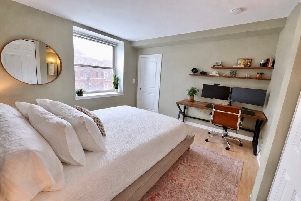 Welcome home to Chateau Thierry Condominium in one of DC's most desirable and iconic neighborhoods of Dupont Circle. It is perfectly located one block off of Connecticut Avenue on a beautiful residential tree-lined street. Features: Updated 1-bedroom 1.5-bath condo home | 545sf of open living space | West-facing oversized windows | Filled w/ natural light throughout & beautiful neighborhood views | Gorgeous modern wide-plank floors | Welcoming entry foyer w/ a closet & hallway gallery wall | Convenient updated Half Bath | Open living room, dining room, & kitchen | Multi-functional layout | Updated & thoughtfully designed crisp white kitchen w/ marble-style solid countertops, glass tile backsplash, under-cabinet lighting & sleek white appliances | Naturally lit kitchen w/ its own window | Breakfast/serving bar | Secluded bedroom oasis w/ 2 double closets w/ custom organization systems | Charming well-appointed ensuite bathroom w/ a shower/tub & separate vanity w/ storage | Updated Central HVAC | Pet-friendly Community Owner pays for electric, water, internet. Minimum 1 year lease.