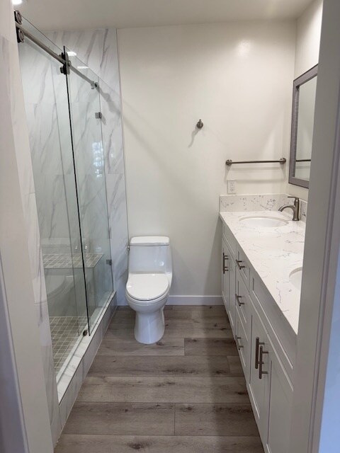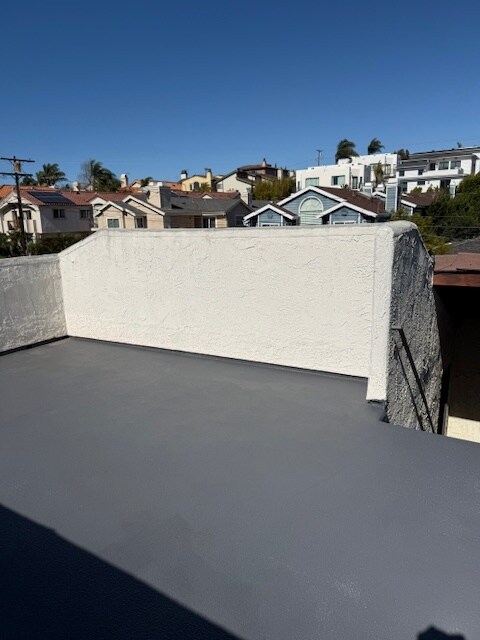 Townhouse-style unit within a four-unit building. The first level includes a fully renovated kitchen and dining area with garden patio, plus living room with electric fireplace. The second level has two bedrooms with large closets; the larger bedroom includes a full sink area. The bedrooms share a full bath. The unit has access to a third-level private rooftop deck area. An enclosed double garage in provided at the rear of the building. No pets