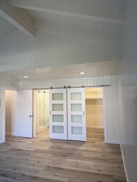 Large Owner's townhouse-style unit within a four-unit building. The first level includes a fully renovated kitchen and dining area with garden patio, plus a half-bath, washer & dryer laundry area, and living room with electric fireplace. The second level has three bedrooms. The open-beamed master bedroom suite includes a full bath, walk-in closet, and balcony. The secondary bedrooms have large closets and share a full bath. The unit has access to a third-level private rooftop deck area. An enclosed double garage is provided at the rear of the building.