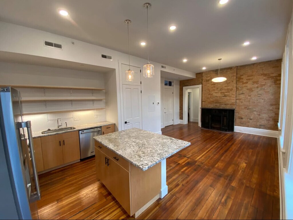 2 bd, 1 ba, 850 Sq. Ft. with 200 Sq Ft Sun Porch | Available NOW New 2BR in the West End! At 1035 Dayton Street, you will be a tenant in this newly renovated 1870's brick Italianate building. Unit includes new stainless steel appliances, historic heart pine floors, exposed brick features, high ceilings, vintage fireplaces, in-unit washer and dryer, and a spacious porch. All of this in the quiet residential area of the West End, within walking distance of Dyer Park, Findlay Market, and the West End Stadium. Unit 5 is a third floor unit. As you enter the unit you will find the kitchen with stainless steel appliances including refrigerator, dishwasher, and stove, as well as granite countertops with pendant lighting above the island. The kitchen opens into a spacious living area with large, bright windows. The bathroom has a stand-up shower lined with subway tile, and a quartz countertop vanity. In-unit washer and dryer is located in the laundry closet. The primary bedroom has large bay window and a closet with built-in storage. The second bedroom has a spacious closet. The porch is exclusive to the unit. Tenant pays for gas and electric through Duke energy, and cable/internet through Altafiber. Central heat & air. Water and trash is included in monthly rent. Dog-friendly (size and breed restrictions apply) $25.00 monthly fee per dog or $500 one time fee per dog. Amenities: Newly renovated New Stainless Steel Appliances Locally made cabinets (Brush Factory) Granite kitchen countertops Historic heartwood pine floors Exposed brick Vintage Fireplaces(3) Porch Bay window Washer/dryer in unit Subway tiled showers Central heat Central air Water Trash/Recycle **NO SMOKING** Rental Terms: Rent: $1,700 Application Fee: N/A Security Deposit: $1700 Available Now Pet Policy: Dogs allowed