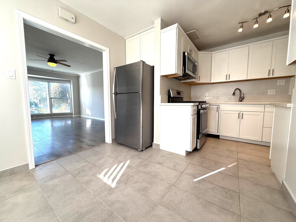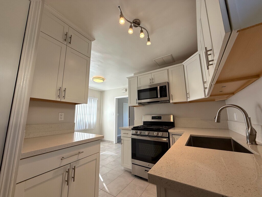 Remodeled 2 BR/1BA first floor unit in prime Mid City location - Bright, Spacious 1000 sqft - Gorgeous, up-to-date kitchen with quartz countertops and high-end stainless steel appliances: Refrigerator/Freezer, Range/Oven, built-in Microwave, handcrafted stainless steel sink, garbage disposal, and plenty of cabinets - Contemporary floors throughout & Italian tile in bathroom, kitchen and dining area - Beautiful modern bathroom featuring porcelain floor mosaics and marble-top vanity - A/C units in living room area and both bedrooms - Ceiling fan in living room - Lots of windows - Apartment has front & back entrances - Secured entry - Parking in single-car garage with electric door & Street parking - Laundry room on premises