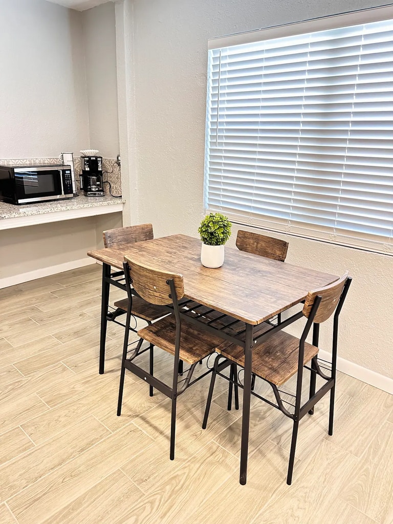 Explore our new one-bedroom tiny home with a queen-size bed, 12-inch mattress, and ample storage. The room is bright, featuring blackout curtains for optimal rest. Relax in the living area with a comfy sofa and 58-inch 4K TV. Includes a dining space, work desk, fast 100 Mbps internet, and a fully-equipped kitchen with a coffee corner. The bathroom is designed with a relaxing bathtub and stylish tiles. Perfect for both relaxation and productivity. -El Paso Furnished Homes.