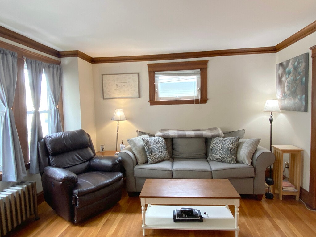 Huge, sunny Oak Square 2 bed with porch! This apartment has lots of common space because of its connected living room and dining room. Kitchen is large enough to fit a table and chairs. Both bedrooms are large, and both have closets! Large, private outdoor porch faces backyard. Laundry and some storage space is available in the basement. This street does NOT have street cleaning OR permit parking– you may park there year-round except for snow emergencies. Driveway is shared with owner but tenants may park 1 car there. Cat friendly. Available July 1st. LOTS of space for the money!