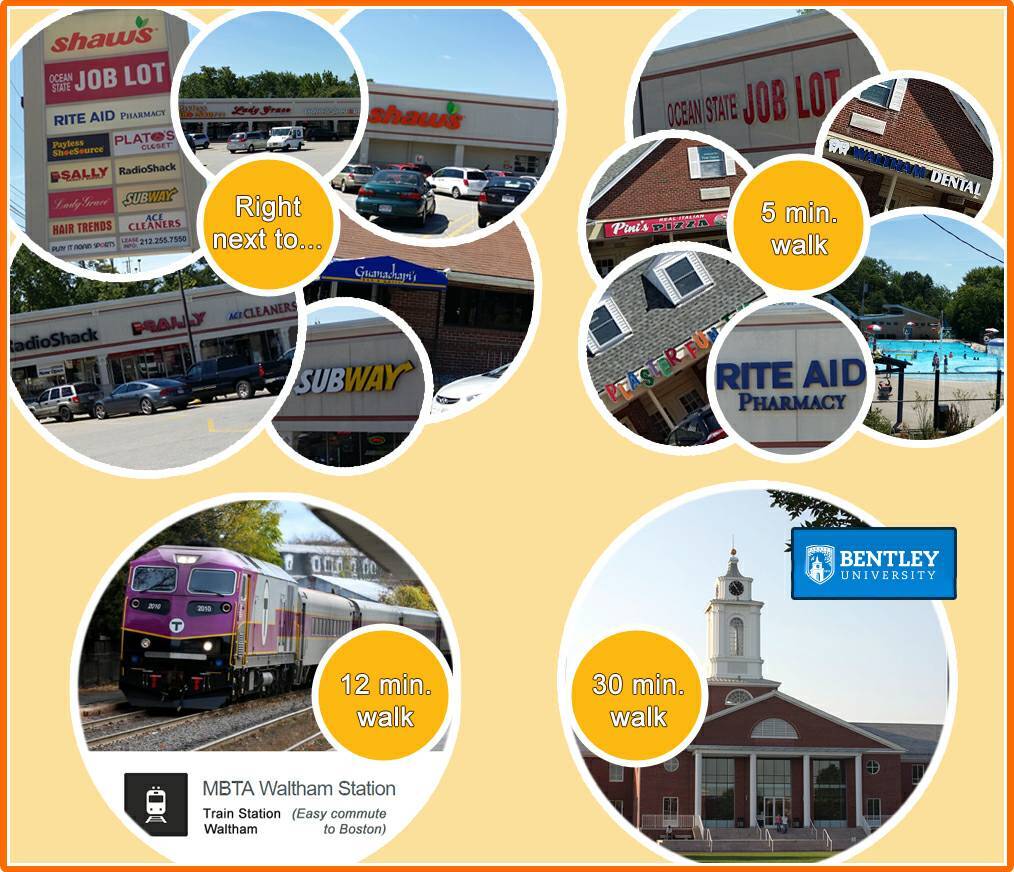 Spacious 1 BR apartment in a nice neighborhood in Waltham. Train only takes 15 MINUTES TO DOWNTOWN BOSTON! Even less to Cambridge (Porter Sq.)! GREAT LOCATION: Right next to a large mall with numerous stores, groceries, Rite Aid Pharmacy, Shaw’s supermarket, Job Lot, Dunkin Donuts, Subway and more. 1 cat or 1 dog is OK! No smoking. Great for students, young professionals, single or couples. Great for dog owners for the apartment has a separate own "private" back door making it easy to walk your dog right onto Charles River bike path! 12 min. walk to Commuter Rail going into Boston. 12 min. walk to Brandeis Van stop. 25-30 min. walk to Bentley University. Steps from Main St. and buses. BRAND-NEW, STYLISH, PVC-FREE, PORCELAIN-TILE FLOOR; 3 large walk-in closets. Parking, hot water, A/C included.