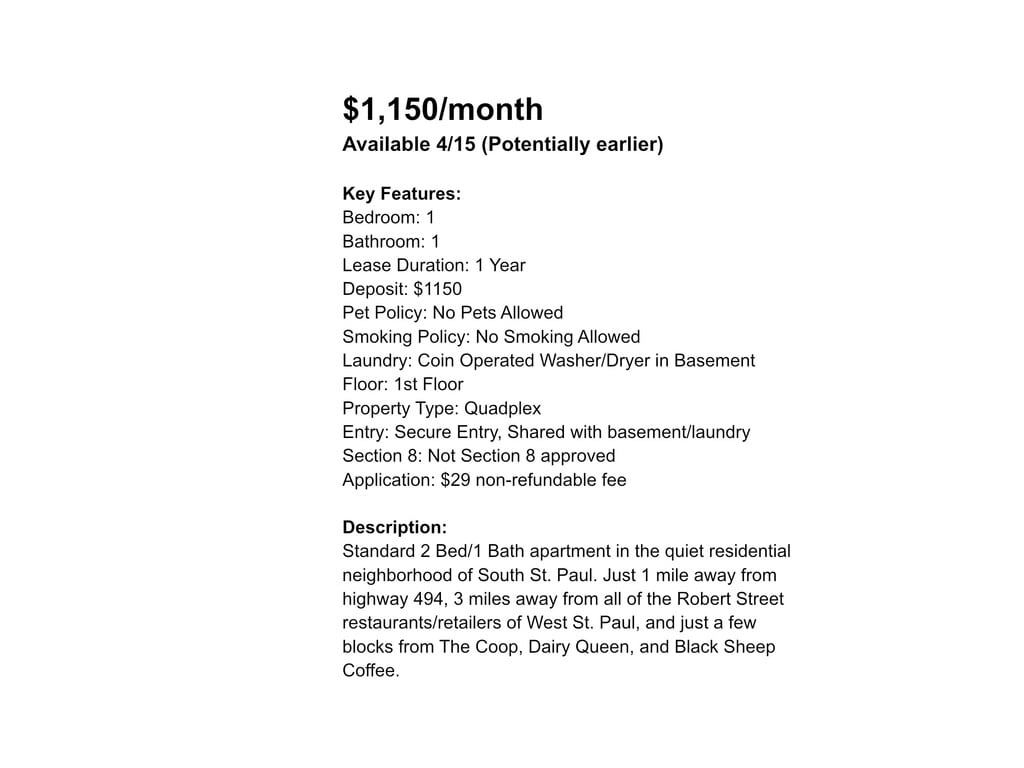 **More pictures coming soon** $1150/month Available 4/15 (Potentially earlier) Key Features: Bedroom: 2 Bathroom: 1 Lease Duration: 1 Year Deposit: $1150 Pet Policy: No Pets Allowed Smoking Policy: No Smoking Allowed Laundry: Coin Operated Washer/Dryer in Basement Floor: 1st Floor Property Type: Quadplex Entry: Secure Entry, Shared with basement/laundry entrance Section 8: Not Section 8 approved Application: $29 non-refundable fee Description: Standard 2 Bed/1 Bath apartment in the quiet residential neighborhood of South St. Paul. Just 1 mile away from highway 494, 3 miles away from all of the Robert Street restaurants/retailers of West St. Paul, and just a few blocks from The Coop, Dairy Queen, and Black Sheep Coffee. Utilities: Included: Water, Sewer, Trash, Heat Tenant Covers: Electric, Cooking Gas, (Internet/Cable, Window A/C can be provided in the summer for additional $25/month) Lease Terms/Qualifying Standards: Occupancy: Limited to 4 people Qualifying Standards: Applicant(s) must meet these standards to be considered for this unit: - Applicant must have current photo identification and a valid SSN - Applicant’s gross income must meet or exceed 3x rent per month ($3,450/month+) - Applicant must receive positive references from ALL previous landlords for the past 5 years (if applicable) - Applicant must have a credit score of 600+ - Applicant must fill out Potential Tenant Questionnaire and Application if they want to be considered - Applicant may be denied if any questions on the forms above are left blank - Applicant must have no past evictions or unpaid judgements from past landlords - Applicant must have no past felonies - A background/credit check will be conducted on all applicant’s over 18
