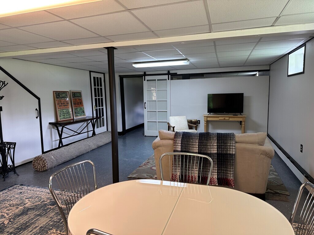 This is a lovely walk out basement "apt" with an open space that combines a small kitchenette and sitting area. It has separate bedroom with a gorgeous barn door. The space has plenty of sun streaming in through the full window and half glass entry door. There is a washer and dryer for your use. Kitchenette includes air fryer, double burner cooktop, microwave oven, fridge and sink. The full bath has a lovely shower stall. Please note pics shown before painted. Rent is $2000 for single occupancy. $2200 for double occupancy, All utilities are included: heat/hot water, electricity, internet, trash pick up and off street parking.