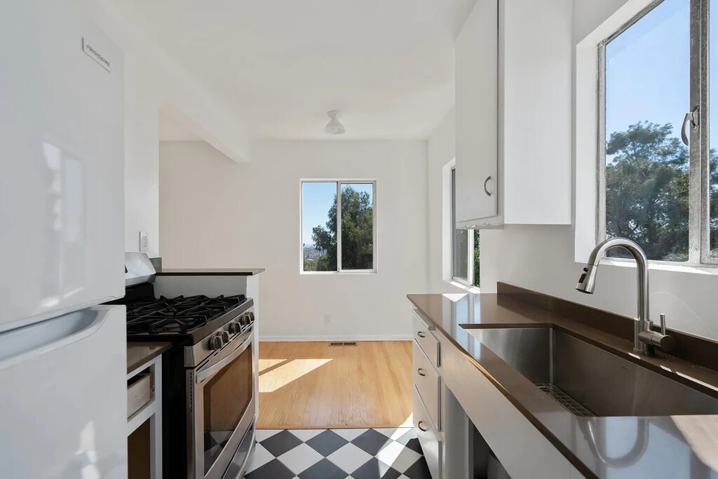 Your perfect private Echo Park hideaway awaits. Built originally in 1950 and recently remodeled, this 1 bedroom/1 bath apartment is tucked away down a private driveway, with views spanning from Downtown LA, to the Hollywood Sign and Griffith Park Observatory. Contemporary, but with 1950s charm still intact, privacy is key as this hilltop property has no visible windows to neighbors. The owner of this duplex has taken great care to make sure this unit feels like home with updated features and special touches such as black and white checkerboard tile flooring and Caesarstone countertops in the kitchen, as well as Schoolhouse Electric fixtures throughout. A new oversized bedroom window is perfect for watching sunsets over the Hollywood hills, while the bathroom has been entirely redone with Honed Carrara marble floors and new fixtures. If you are looking for a quiet unit, the top floor has a 1 inch rubber mat added under the flooring to make for an incredibly quiet ground floor space to call your own. A sizable outdoor space is included at the entrance of the unit with a spacious concrete patio large enough for a full dining set and patio furniture. Owner is planting new hedge bushes before move in for additional privacy. There is also a second entrance through the in-unit laundry room complete with storage and stackable laundry units. Central AC and heat are included, plus one parking spot underneath the carport. Centrally located near Silver Lake Reservoir, dog park, Elysian Park trails, Cookbook, Canyon Coffee, Whole Foods and Sprouts. Tenant to handle all utilities and renter's insurance. First open house to be Saturday December 13th, and Sunday December 14th 12-3pm.