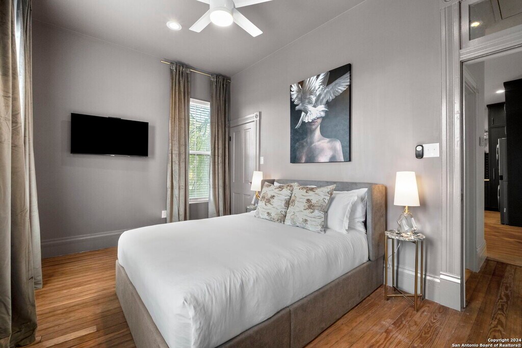 This fully furnished, designer reimagined 2 bed, 2 bath unit sits on the 2nd floor of a charming corner lot townhome with a private fenced yard. Enter through a shared foyer to your private entrance at the top of the stairs, where you'll find custom cabinetry, quartz countertops, stainless steel appliances, and beautifully refinished original hardwood floors throughout. The unit has been completely updated with new paint, electric cooking, a new foundation, separate HVAC system, ceiling fans, lighting fixtures, and window treatments, plus enjoy a wrap-around covered patio with stunning downtown views. Yard maintenance is included. Call/text/email Madison Peterson Leasing Specialist Exquisite Property Services