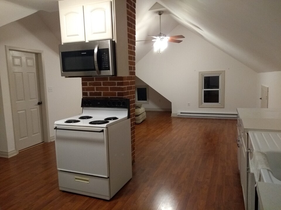 Spacious 1 Bedroom apartment with open concept kitchen/living room on 3rd floor. Large Bedroom with ample closet space. Appliances include washer/dryer in unit, microwave, fridge, and stove. Rent includes water/sewer/trash. Tenant pays electric/heat. The space is well insulated and energy efficient. One off street parking space is included. Absolutely no smoking. No pets. Maximum occupancy of 2 people. Background, credit check, and proof of income required. First month rent and refundable security deposit to move in.