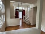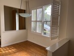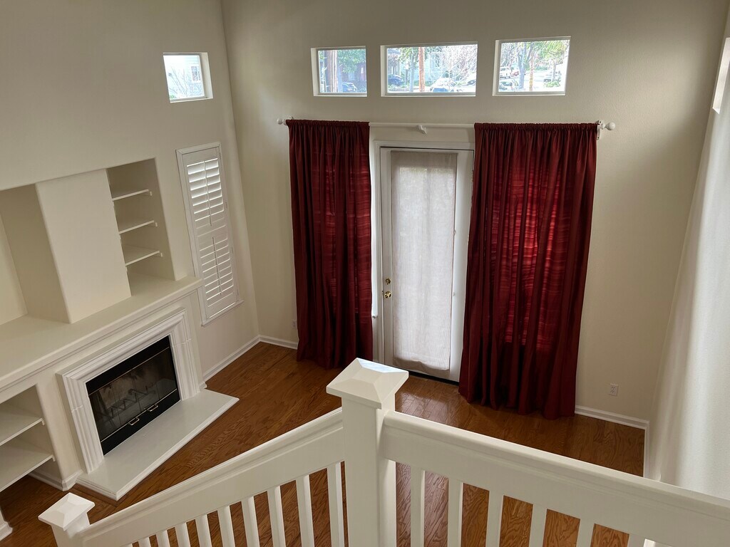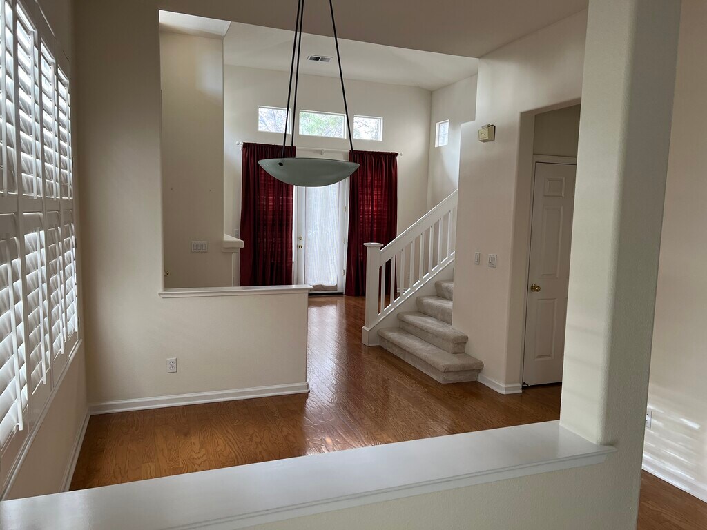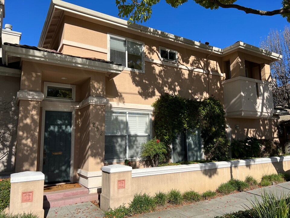 Bright and sunny 2 story house in great downtown-north location. Easy stroll to downtown and CalTrain. Master bedroom with large walk-in closet and built-in task desk. Double vanity in master bath with large built-in tub/shower. Full sized washer and dryer upstairs. Second bedroom with private full bath. Hardwood floor downstairs in living room and dining area. Wood burning fireplace. Outside patio off living room. Two car garage with very quiet opener. Lots of extra storage. Gardener included.