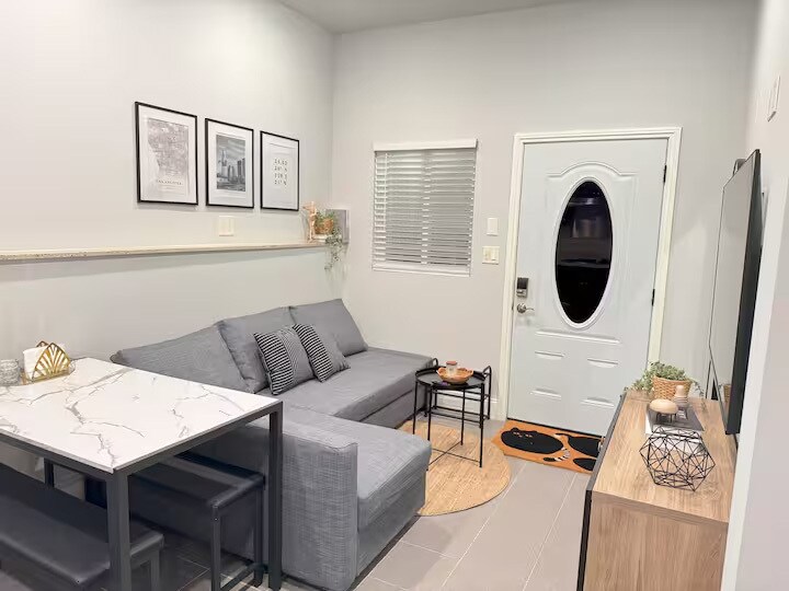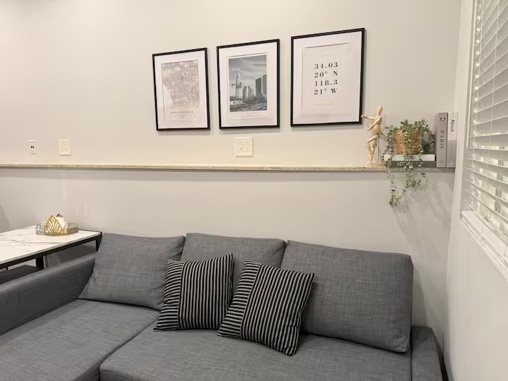 This cozy, yet charming 1 bed 1 bath unit, perfect for individuals or couples and features spacious 10' high ceilings and elegant recessed lighting that create a warm and inviting atmosphere. This apartment is located on the 1st floor of a 2 story house with your own dedicated parking spot with no shared walls, except a shared ceiling with the upstairs floor. EV Charging available - renter furnished Modern look Quartz countertops Central heat and air conditioning Convenient access -1 mile from both the 60 and 10 freeway.