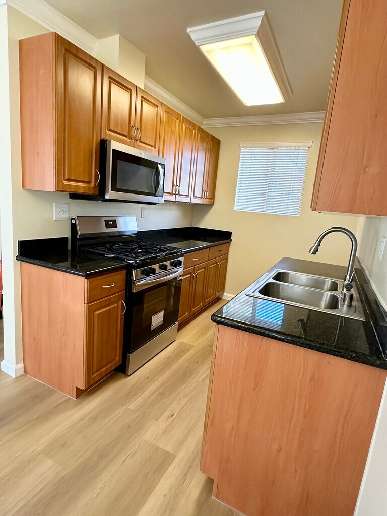 $2050. 2 Bedroom 1 bath Condo/Townhouse approximately 900 square feet. Located on a tree lined cul-de-sac near schools and shopping. This beautiful, spotless unit with lots of natural light is fully remodeled with brand new flooring and fresh paint. Security building. Stainless steel kitchen with brand new gas stove, plus microwave, dishwasher and granite counter tops. Upgraded with crown molding throughout. Walk in closet in master bedroom and both bedrooms have mirrored closet doors. Central heating and air conditioning. Complex has two pools, a well equipped gym, laundry facilities and a club house. HOA has a small private gated park with a basketball court, children's playground and barbeques. Water, trash and HOA dues are included. One assigned covered parking space is included. Dog permitted with renter's insurance. Sorry, no smoking. View the property any time by appointment. Available now.