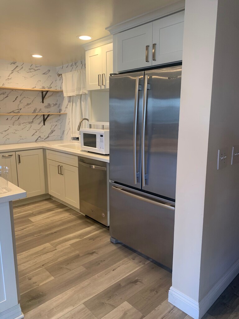 Beautiful spacious condo with two side by side garage parking spaces in an amazing location! This 2 bedroom, 2 bathroom home is a rare find, ideally located a couple of blocks from the beach, and near many wonderful restaurants and shopping along 4th street. You enter the open concept kitchen- bright, with stainless steel appliances, custom soft close cabinets, beautiful white quartz countertops tops and tile backsplash, with tons of cabinet space. The kitchen island includes a compartment for trash and recycling. From the kitchen, you can look out into the spacious living room and onto the balcony. The living room includes custom built bench seating that also acts as a hidden storage space! In the hallway, you have washer-dryer combo, side by side- and additional storage shelving. The master suite has an upgraded and fully customized bath. Dual sinks with double mirrored closets transition to the barn door, opening to a spacious shower with bench seating, an extra vanity, and the toilet. The master bedroom is large- plenty of room for a king bed! Second bedroom is large and can be used as an office or guest bedroom. The guest bathroom has been upgraded with newer sink, custom cabinets and countertops. This is a secure building, and a great location to be in. You can be walking distance to Alder and Sage, Gusto’s bread, and more! Yoga on the bluffs, Farmers Markets at the park- there’s plenty to do and see.