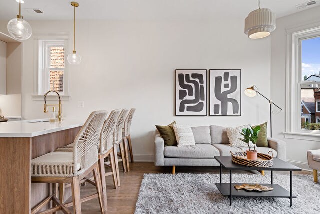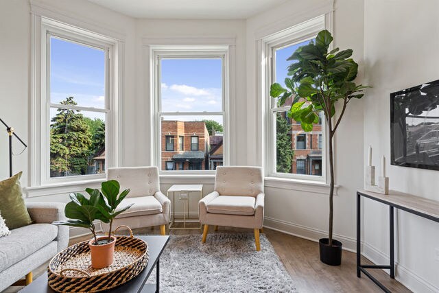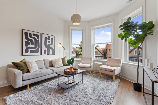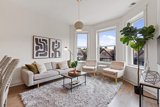 In the heart of Ukrainian Village and steps from Wicker Park, this stunning apartment is a top floor unit in a boutique vintage building. This home has condo quality features, thoughtful design with high-end and cohesive fixtures and finishes, it is lined with windows providing amazing natural light and offers amenities that few to none provide in the neighborhood. There are three bedrooms which have great space and layouts, have large windows and great closets. The primary bedroom is lined with exposed brick walls and features an ensuite marble bathroom with high end finishes. The secondary bathroom is also tastefully designed and includes fixtures from Kohler and CB2. In the European inspired kitchen, you'll find tons of cabinet space, a vented microwave, garbage disposal, gas range, an island with walnut paneling and space for four barstools and much more! Central heat and AC, stacked washer/dryer, a large additional storage room in the basement dedicated for this unit make this apartment worthy of calling home. Incredible location in Ukrainian Village - this is an extremely walkable neighborhood and unbeatable location for commuters. Building is managed by an accommodating and highly responsive focused on providing an excellent experience for their tenants. One garage parking space available for additional fee. Cats are typically allowed. Pet fee of $30/mo. Tennant pays gas, electric, wifi.- Courtesy of Redden+McDaniel - Contact Jorge at Smart Home Realty