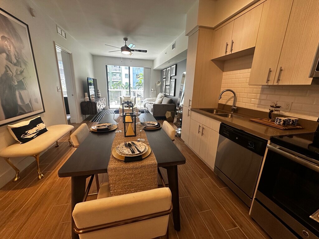 This contemporary residence offer spacious layout designed for modern lifestyles. Enjoy open-concept kitchen with sleek island, stainless steel appliances, and soft-close cabinetry, as well as large closets, in-unit washer and dryer, and elegant porcelain wood plank flooring. Featuring high ceilings, soaking tub, and private balcony or two-story loft terraces for elevated living. Beyond your front door, resort-style amenities await. Relax by the heated pool or on the elevated sundeck, host friends in the shared courtyard with grills and a fire pit, or stay active in the state-of-the-art fitness center with yoga and spin studios. Pet owners will love the dog walk and pet spa, while residents enjoy modern perks like Amazon Hub package lockers, EV charging stations, and gated access with an eight-story parking garage.