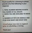 PLEASE READ THE AD BEFORE RESPONDING~~PLEASE READ THE AD BEFORE RESPONDING To pre-qualify for a showing to please provide all of the following in your response: 1. TOTAL NUMBER MOVING IN WITH FULL NAMES OF ALL ADULTS 2. WHEN YOU ARE AVAILABLE TO MOVE IN 3. PLEASE PROVIDE A CONTACT PHONE NUMBER. A brief phone interview is required prior to scheduling a viewing. Thank you!