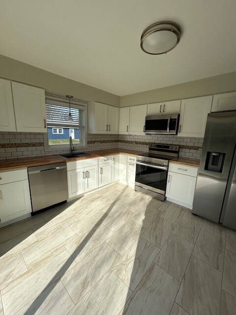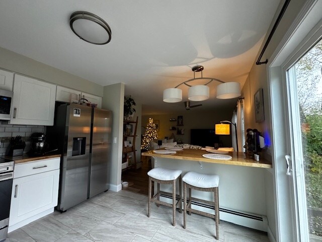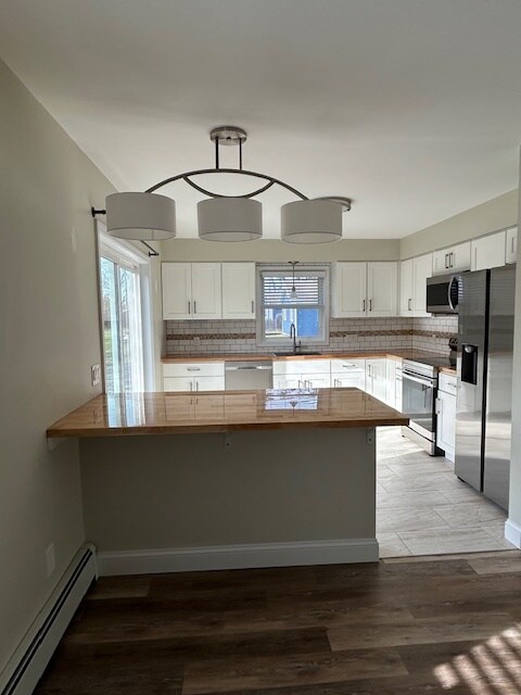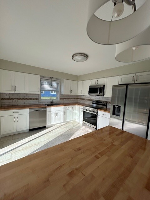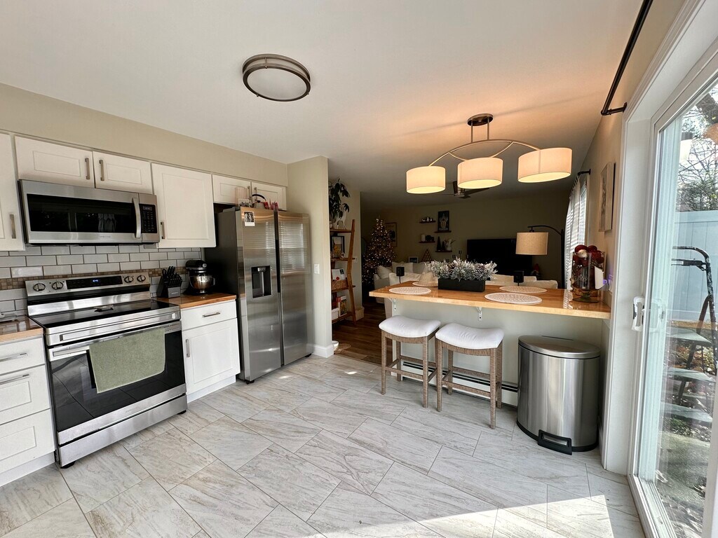 Beautiful completely renovated DUPLEX. Nice open floor plan with good light. Easy access to private back yard from sliding door off kitchen. Features 2 large bedrooms, big closets, large living room flowing into kitchen with breakfast bar. 1 car garage with electric door opener. Completely repainted throughout, all new flooring, appliances, trim, windows, interior and exterior doors lights and plumbing fixtures throughout. EVERYTHING is new. An amazing kitchen with custom cabinets, tile accents, all the new appliances. Includes custom mini blinds and curtain rods throughout. Large spacious yard in quiet neighborhood. New stainless-steel appliance; range refrigerator and dishwasher microwave hood fan and washer dryer. Custom walk-in shower, large vanity, good storage with linen closet in bath. Gas heat; new energy efficient furnace with baseboard hot water heat. No smoking or pets please. Easy access to Burlington via 127 beltway. Tenant pays for utilities, rubbish, lawn care.