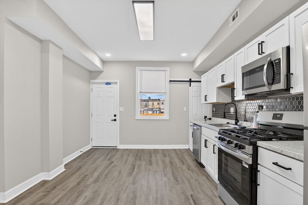 GORGEOUS RENOVATED RENTAL CITY TOWNHOUSE IN PENROSE/LEXINGTON** This amazing 3-bedroom, 1-bathroom home boasts modern updates, architectural interest, and Baltimore charm throughout! Renovated, this move in ready gem features comfortable living room with attractive neutral paint, leading into the separate dining space and HUGE eat-in kitchen, gas cooking, shaker cabinets, led lighting, stainless steel appliances. Upper level offers three spacious bedrooms with carpet flooring, accompanied by full modern bath. Central Air conditioning and heating, large backyard is ideal for your Cookouts and Entertaining!