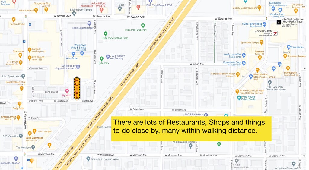 LOCATION, LOCATION, LOCATION, Upscale Hyde Park Neighborhood * No Lease Required for Month to Month rental * Fully Furnished * All Utilities Included * Weekly Maid Service (weekly and monthly only) * 55” Smart TV * Free WiFi OPTIONS: 1 Month - $250 Security Deposit, Tax 13.5% Weekly - No Security Deposit , Tax 13.5% Call for Weekly Price GREAT LOCATION IN HYDE PARK CLOSE TO EVERYTHING * Less than 2 miles to DOWNTOWN, Convention Center & St. Pete Times Forum * MINUTES TO MACDILL AF BASE!! * Short drive to Tampa General & Memorial Hospitals * In an up-scale neighborhood, Historic Old Hyde Park * Walk to Grocery store, CVS, Starbucks, Restaurants, Shops and entertainment * Free WiFi, Water, Electric * Weekly Maid Service (weekly & monthly only) * Full Kitchen with Range, Refrigerator, Microwave. This Beautiful fully furnished Studio located in Hyde Park, Tampa FL, a very exclusive up-scale neighborhood. No need to drive with grocery store, Starbucks, CVS and several fine Restaurants less than a block away. If you like to walk, bike or run, Bayshore Blvd. features the longest contiguous sidewalk in the world is on the bay 1/2 mile away. A short walk brings you to Hyde Park Village with several fine restaurants, entertainment and shops. Centrally located in South Tampa, with quick and easy access to I-275, I-4, and Dale Mabry, makes for a short drive to just about everything in the Bay area. The building is a Historic Hotel built in the 1920s and recently renovated and upgraded. Everything is provided including linens, and even maid service and utilities. All the rooms are equipped with a full kitchen with range refrigerator microwave if you prefer to dine in.