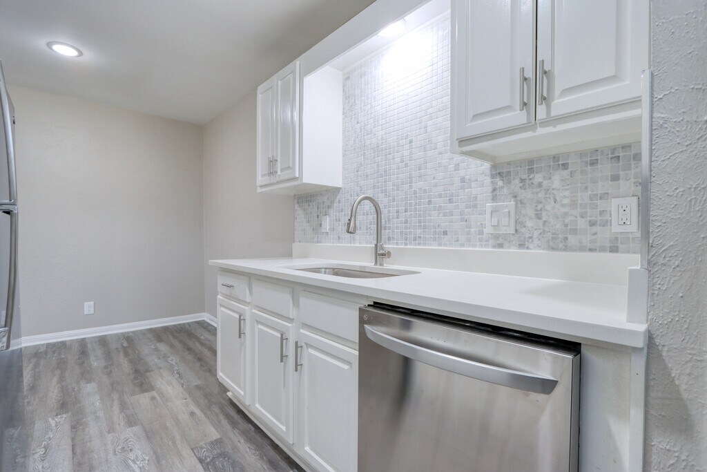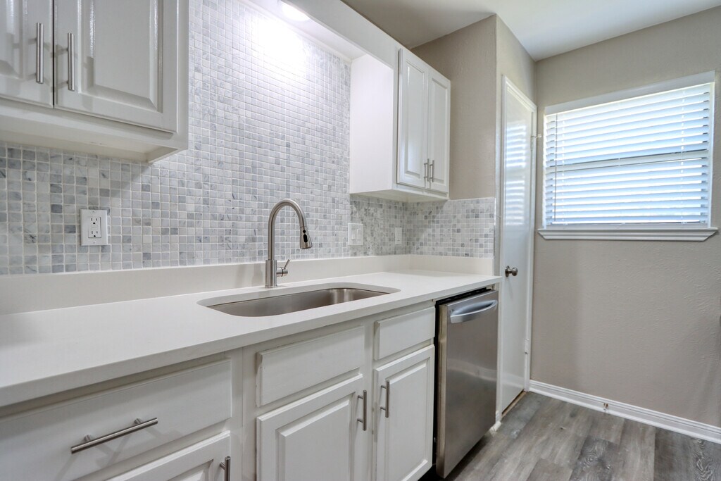 This HALF DUPLEX HOME WITH A LARGE BACKYARD was transformed through a complete renovation in 2026, using a modern grey and white color scheme with satin nickel fixtures! The kitchen has been renovated with all NEW white quartz kitchen countertops, REAL MARBLE backsplash, large stainless kitchen sink, kitchen faucet, cabinets painted white, and cabinet bar handles. The kitchen also has all NEW stainless steel appliances, including a refrigerator/freezer, dishwasher, stove/oven, and range hood. The bathroom has been redone with a new bathtub, porcelain marble look shower walls, REAL MARBLE shower mosaic, and bathroom fixtures. The entire home has all NEW luxury vinyl plank flooring, ceiling fans, light fixtures, doorknobs, 2 inch faux wood window blinds, and window screens. The interior and exterior were both freshly painted. Laundry closet with a door, enclosing a brand new washer/dryer. Your very own concrete driveway, and a large grassy backyard that backs up to a HUGE grassy field!