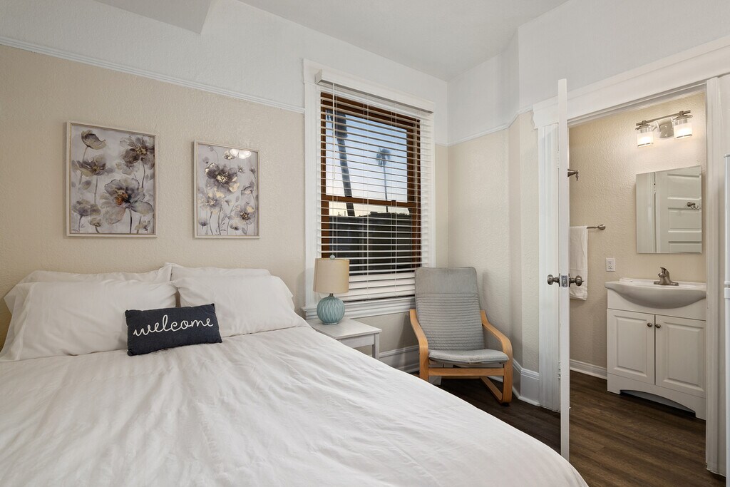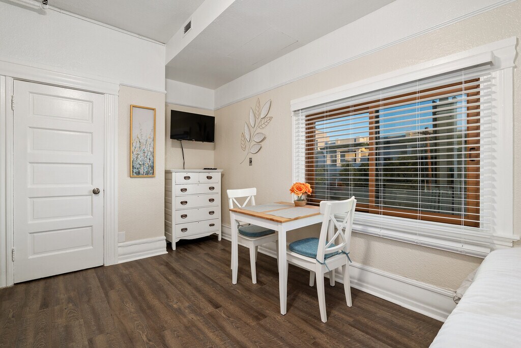 Ocean views; professional quiet building. Historic Landmark. Central location. Huge patio and decks; budget friendly, Visit our website: The Hawthorne Historic Inn in San Diego WE have a library/office for free use. Very fast internet. On site manager. FULLY FURNISHED....sheets, towels, etc. All cooking utensils. Perfect for traveling professionals/students Central location - CLOSE to downtown, little Italy, Balboa Park Every unit has a microwave, a full size refrigerator, free internet....