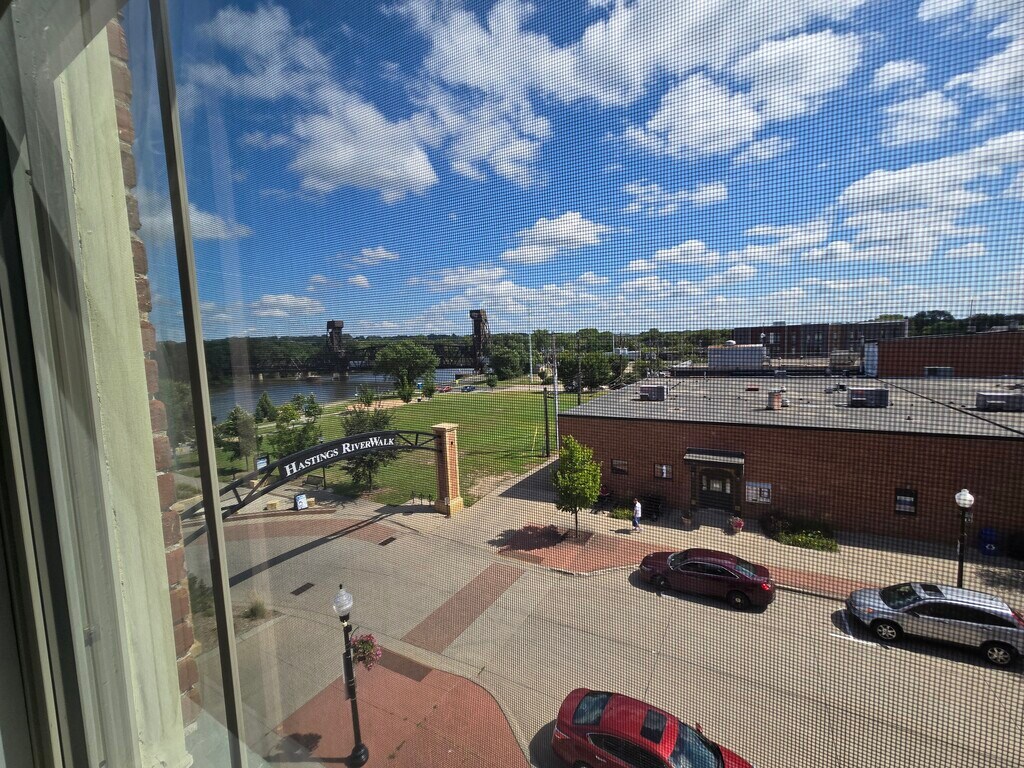 Don't miss this rare opportunity to live in beautiful downtown Historic Hastings right on the Mississippi Riverfront. This 2 bed/1 bath unit sits on the third floor of the Gardner Building facing east with a view of the Mississippi River. Unit has high ceilings with multiple massive windows that let in tons of natural light. Unit has central AC and heat. The Gardner Building is in an unbeatable location on the corner of Ramsey and 2nd St. just steps away from Levee park where you will find access to miles of walking and cycling trails. You can also find tons of popular local dining spots less than a 5 minute walk away. There is coin operated laundry on site. No pets. No smoking.