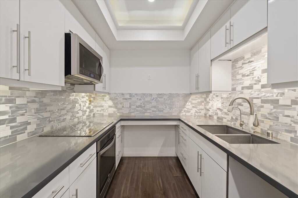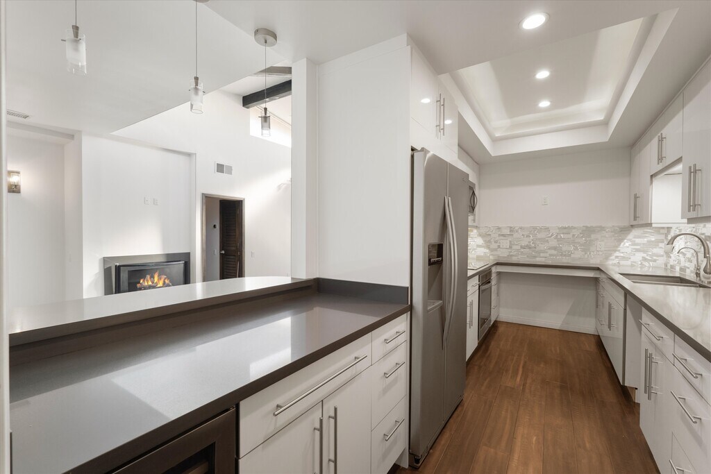 Spectacular front facing 3 bedroom 3 bath Top-Floor penthouse! South facing with vaulted ceilings and skylights bring amazing light and bright feel to this exceptional unit. Spacious open concept living, dinning, and family Completely remodeled kitchen and bathrooms. The kitchen is complete with stainless steel appliances, contemporary countertops, breakfast bar and wine cooler. Master suite has large window, walk-in closet, and spacious master bath. Two other bedrooms with big windows and tons of light. Patio off of the living room. Complex has pool and EV chargers.