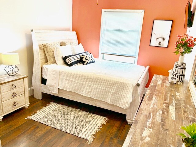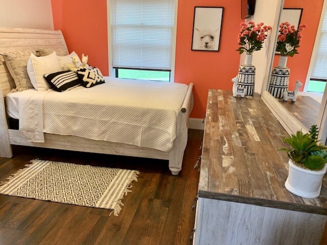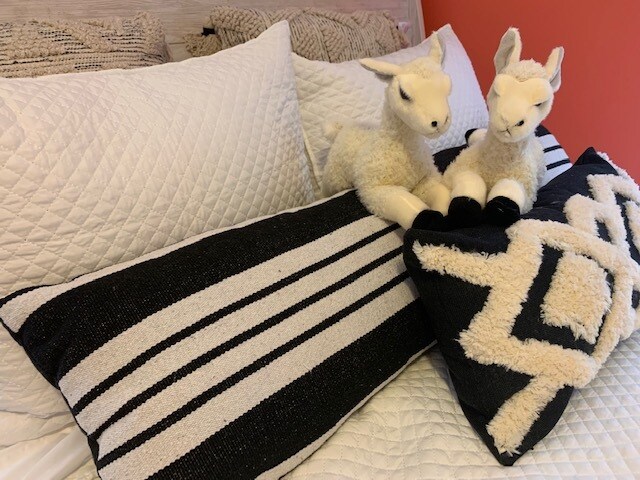 The Brookview cottage penthouse is just that, with great views from your deck of our wooded area and Sawyer Creek that crosses the corner of our lot, you’ll see an abundance of wildlife to include our family of woodchucks, raccoons, squirrels, deer, cranes, ducks and more. This is our junior penthouse with a vibrant cottage coastal vibe. The living room has an expansive white leather sectional that can be reconfigured as you desire and a large flatscreen and electric fireplace. Modern black and white canvases of local waterways adorn the walls throughout this entire space, custom created for these properties. The master suite is an expansive dreamy home away from home with a specially procured rustic flooring, new king bedroom set and decor to make you feel like you’ve docked your yacht for the night. Secondary bedroom has a lovely queen bedroom set and a joyful llama inspired design your guests or family members will adore. Yes to your own garage, lovely deck, private laundry and all the amenities!