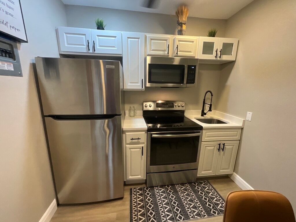 Se habla espanol pictured unit was rented, 2 studios are currently in Constuction with the expected completion date end of the month Newly built studio apartment on a quiet street in 34743 Buenaventura lakes. The apartment has a dedicated parking space and a private entrance. The apartment is fresh, clean and was built with modern look. The unit was built with a nice size kitchen that has a large refrigerator, full size stove full size over the range microwave, a dedicated kitchen sink The kitchen has allot of cabinets for storage. The home has stainless steel appliances, wood plank floors. The unit also has a full bathroom with a tub, new toilet has a new vanity. The unit comes with its own Wifi on Att Fiber. TERMS: no smoking, space is ideal for 1-2 people, FREE APPLICATION on other site Zill DEPOSIT BASED ON APPLICATION BVL has close proximity to walking distance Publix and restaurants, close to drive to turnpike and 417 that gets you anyway quickly