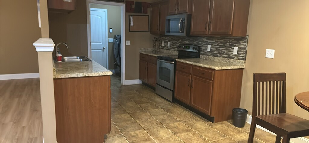 Ready Now! One story handicap accessible home, three bedrooms two baths, 14 73 ft.² with open floor plant. Master bedroom has separate bath with shower and large tub and walk-in closet and double vanities. Dining area off kitchen and laundry room is also off kitchen between kitchen and garage. Central heat and air. All new laminate flooring no carpet carpets. Large two car garage and extra large backyard with grass. Fireplace in living room area.. I would probably put my couch that goes around in here TV. I don’t know how to arrange this room put a couch there circle around that way.