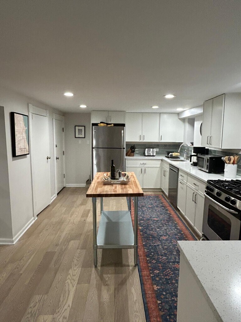 What makes this property stand out is how intentionally it has been designed and furnished for real living, not short-term turnover. This is a home created for people who plan to settle in, work comfortably, and enjoy Lincoln Park day to day. The apartment offers approximately 1,000 square feet of thoughtfully renovated space in a classic brick-and-stone building. As a garden-level residence, it provides a level of privacy and separation that many renters appreciate, while still being located immediately adjacent to DePaul University and within walking distance of transit, dining, parks, and the lakefront. Inside, the layout is efficient and purposeful. Recessed lighting throughout and a neutral, modern finish palette create a bright, welcoming interior that lives comfortably despite the garden setting. The space feels calm and intentional, with furniture scaled for everyday use rather than short-term staging. A key differentiator is the separate, dedicated home office, fully furnished and designed specifically for remote work. This is not an improvised desk in a bedroom or corner of the living room, but a true workspace that allows residents to maintain a healthy separation between work and home life. For professionals, visiting faculty, or anyone working remotely, this feature alone meaningfully improves day-to-day quality of life. The kitchen has been fully updated with stainless steel appliances and is stocked with cookware, utensils, knives, and dishware, making it well suited for regular home meal preparation. This is a space designed to be used, not just admired. Whether cooking daily or occasionally, residents have everything needed to live comfortably without bringing their own household items. Additional features such as in-unit washer and dryer, Sonos whole-home audio, and ample storage further contribute to the turnkey nature of the apartment. All utilities and high-speed internet are included, offering predictable monthly costs and removing the friction of setting up multiple accounts or managing variable expenses. Location is another major strength. The apartment is situated on Bissell Street, immediately adjacent to DePaul’s Lincoln Park campus and close to the Fullerton and Armitage CTA stations. While the elevated train operates nearby at street level, the unit itself is set back from the tracks and experiences noticeably reduced train noise indoors. This allows residents to benefit from excellent transit access while enjoying a calmer interior living environment. Garage parking is available for those who need it, adding convenience in a neighborhood where parking can be limited. The building itself is well maintained and offers secure entry, contributing to a sense of stability and ease. Overall, this property stands out because it strikes a rare balance: central and well connected, yet private and livable; fully furnished, yet not generic; efficient, yet comfortable. It is particularly well aligned with multi-month stays for individuals or couples seeking a high-quality home base in Lincoln Park—one that supports work, daily routines, and a genuine sense of home rather than a temporary stop.