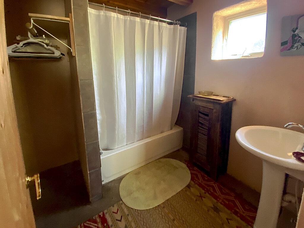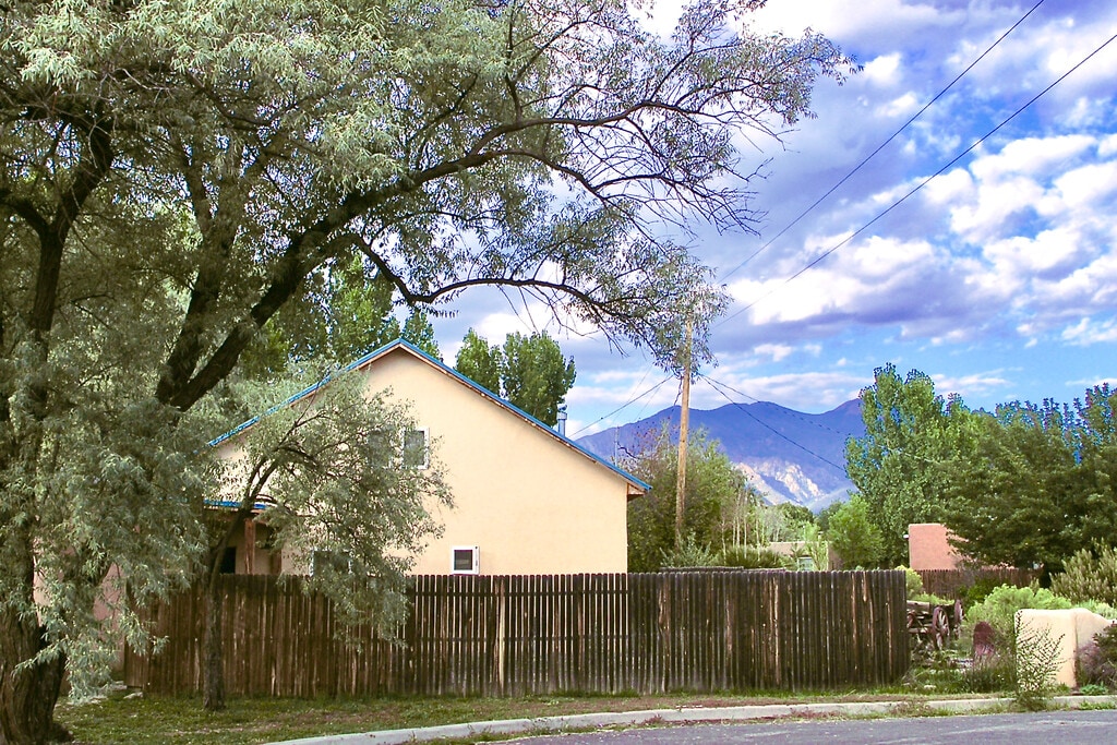 Spacious, Quiet Furnished Artist's Studio and Mountain Views The studio is located on a verdant, tree-lined, dead-end street. The quiet neighborhood is a short walk to Taos plaza, coffee shops, restaurants and art destinations. You'll enjoy an open, pumice-construction, artist's studio to work on your creative endeavors. Painters, writers and musicians are welcome to this simple, quiet, comfortable and Zen-like studio to free your mind and focus. Play your favorite music on the fabulous sound system. Studio washer and clothes line in studio. Radiant floor heating is clean and quiet. Studio is available for your personal use. It is not a commercial space, so not available for hosting in-studio workshops or gatherings.