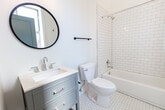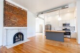 2BR + 2BA + Flex room (ideal for dining/entertaining area or home office) 10'-6" ceilings Private outdoor covered balcony Private historic entry porch and vestibule/mudroom Butcher block kitchen island Gas range Original decorative marble fireplace En suite master bath with dual vanity and subway tile shower stall Refinished original pine flooring Laundry closet with full-size washer and dryer Full bathtub and shower with subway tile surround