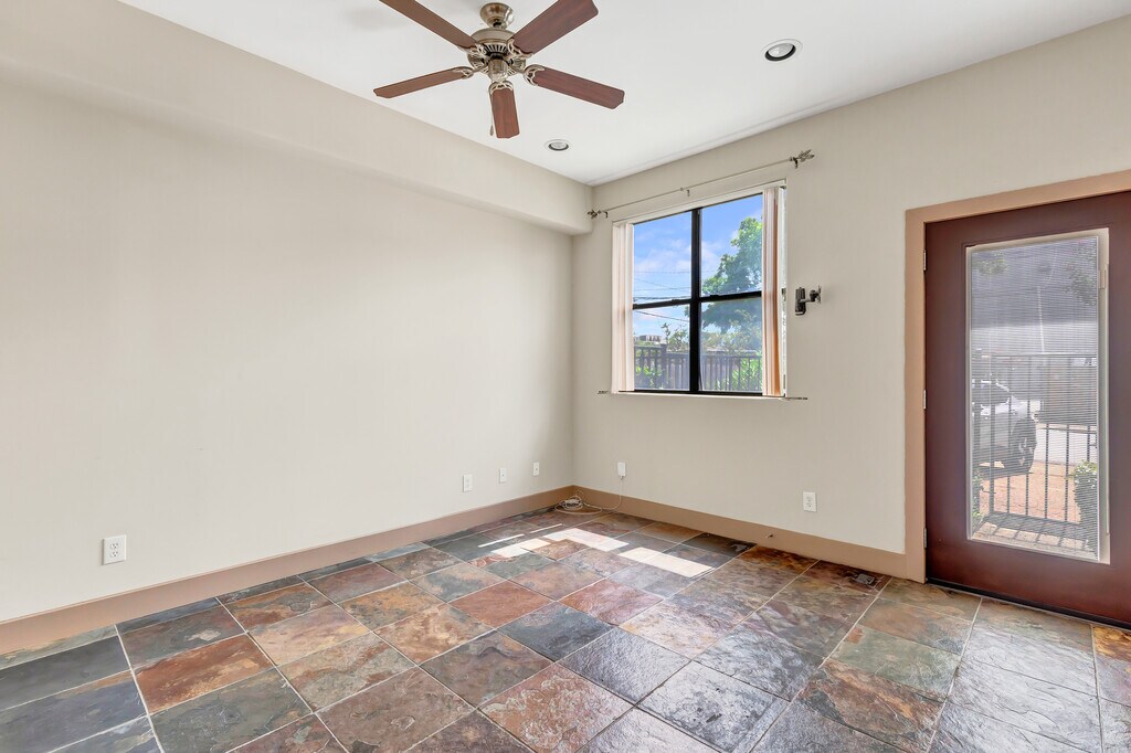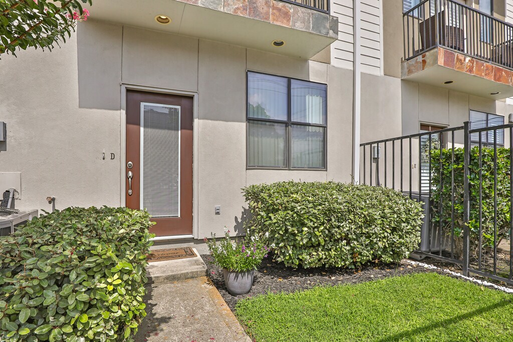 Convenient location, great downtown skyline views, walking distance to trendy restaurants and coffee shops. This beautiful home is minutes from downtown and the Buffalo Bayou trails. Three story contemporary town home has an open plan living with double french door to balcony. Front fenced yard 18x12 is ideal for pet owners. Gated entry to rear driveway/garage. Extra parking in front. Living room w/high ceilings and gleaming hardwood floors. Over sized island kitchen with granite, natural wood cabinets, stainless appliances. Spacious master with cathedral ceilings, built in bench and downtown/fireworks view. Master bath has granite counter top, travertine floors, double sinks, shower/whirlpool. Secondary room on the first floor dimension is 13x9, it's currently staged as an office will fit a queen sized bed ( dimension 5'0" x 6'8"). Includes washer/dryer and refrigerator.