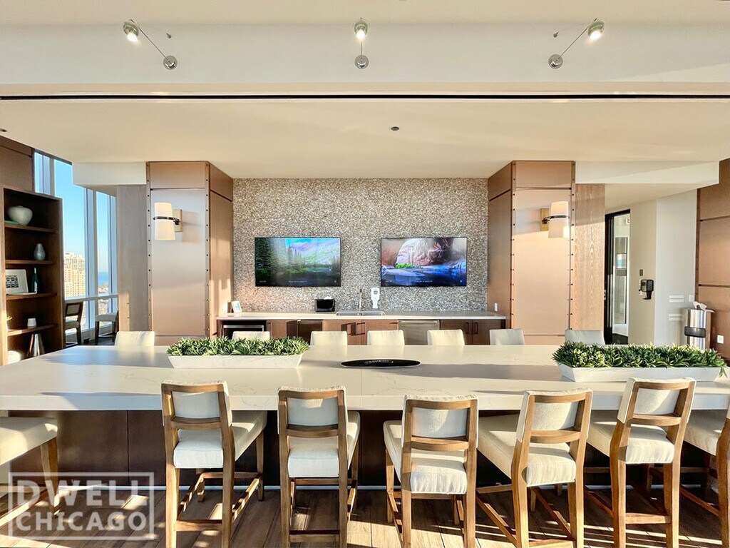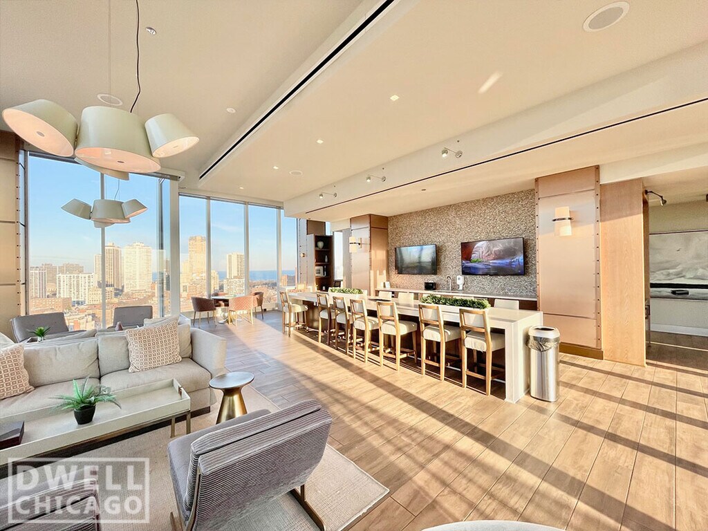Building amenities include a fitness center and yoga studio; game room with arcade, shuffleboard and pool tables; sky lounge with entertainment kitchen; co-working lounge; rooftop pool, hot tub, sundeck, and dining area with seating and built-in grills; pet spa and owner’s lounge; private dog run; children’s playground; bicycle storage; on-site parking garage for residents and guests; hotel-style concierge services and 24/7 attended lobby; dry cleaning pick-up/drop-off service; automated package lockers with cold storage for grocery and flower deliveries; complimentary coffee bar; and on-site maintenance and management.