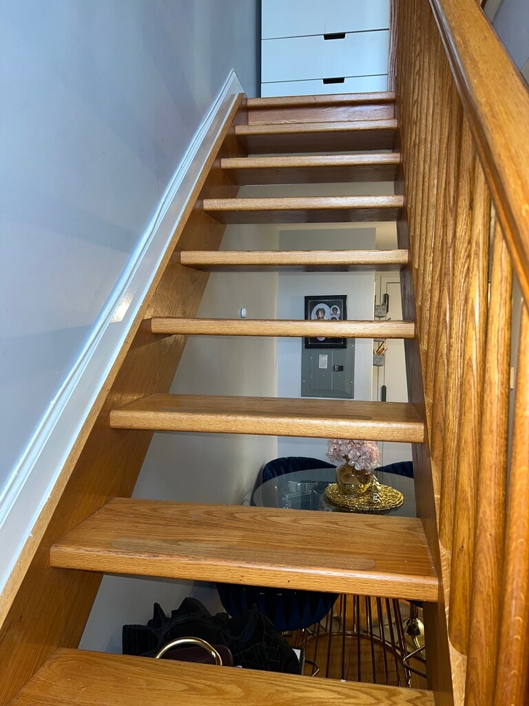 One bedroom, one bathroom duplex with balcony, hardwood floors throughout, living and dining area, kitchen.