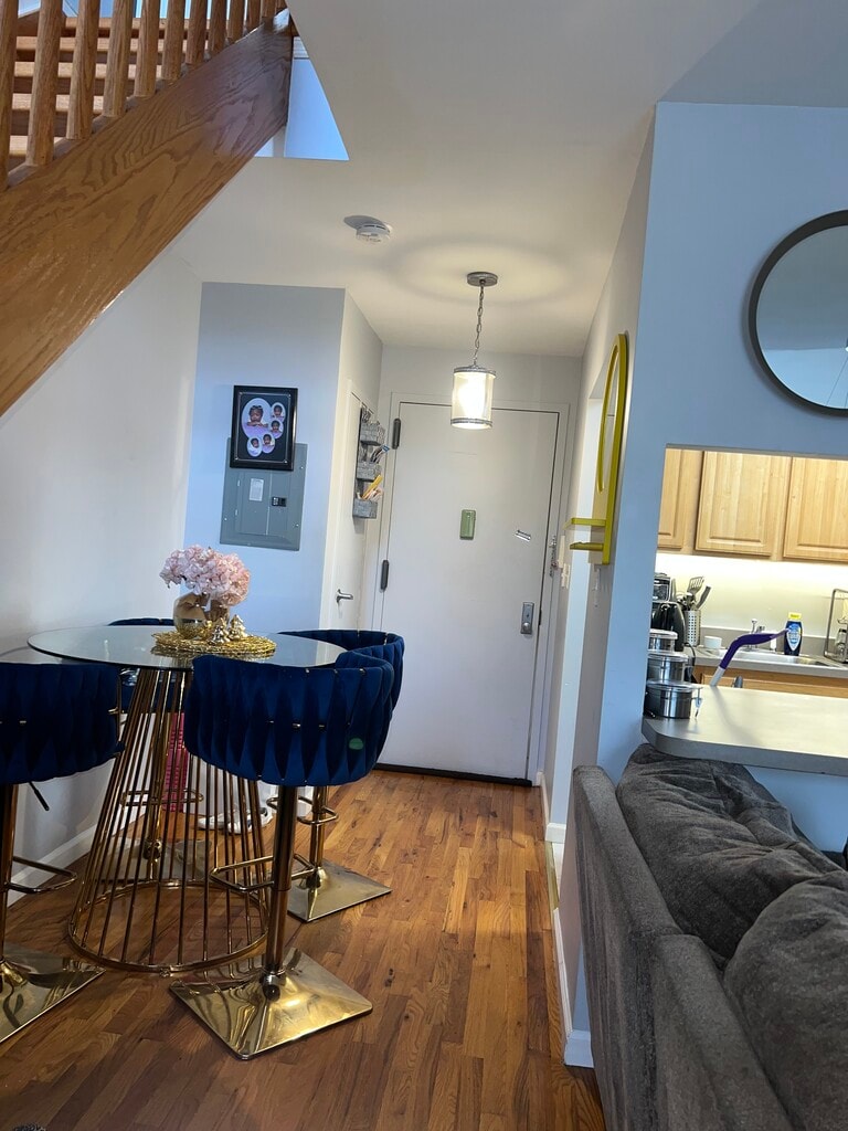 Stylish one bedroom, one bathroom duplex apartment with balcony, hardwood floors throughout. Kitchen and dining area.
