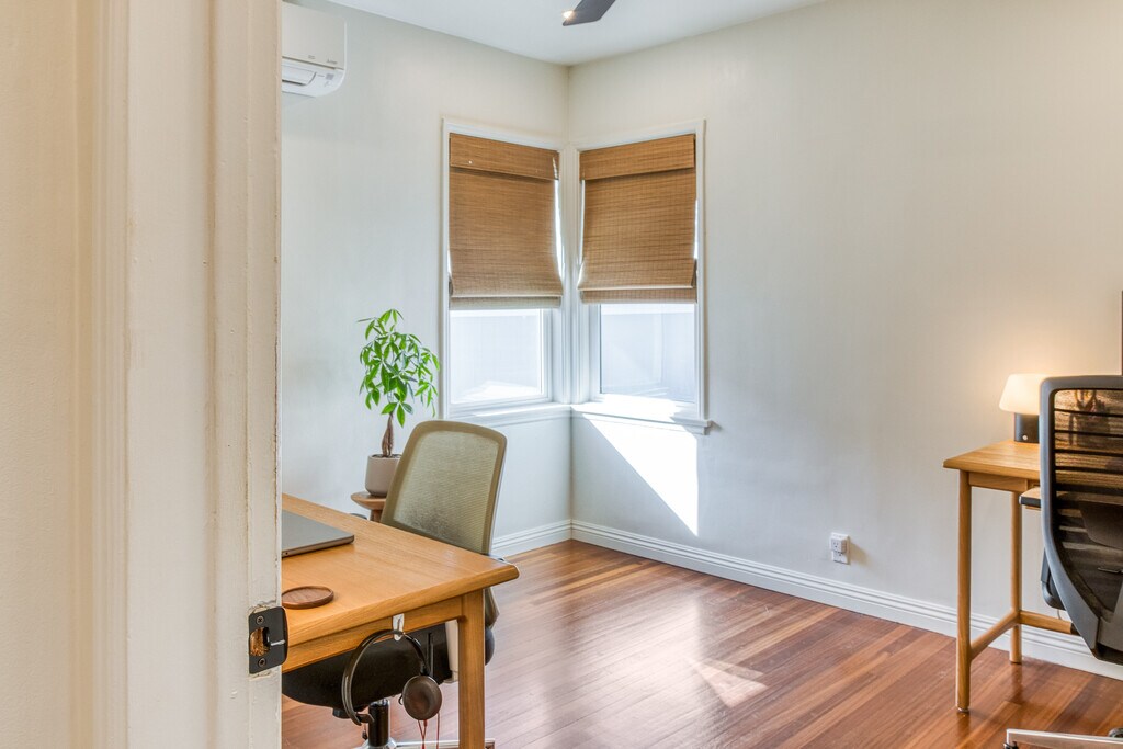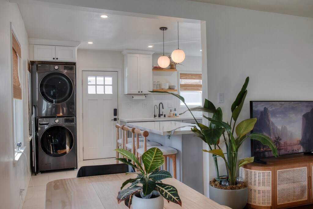 Beautifully remodeled front unit with modern upgrades! 2Bd/1Ba with 1 reserved parking space, in-unit washer dryer, and shared backyard. Kitchen has been upgraded with new cabinets and flooring, quartz countertops, large peninsula, dishwasher, and filtered water spout. Bathroom includes new shower and heated floors. Newly installed mini split/heat pump system in living room and both bedrooms provide AC and heat. Newly installed smart lights and ceiling fans. Access to large shared backyard with 1 off-street parking space provided and outdoor outlet for EV charging. Centrally located to the Long Beach airport, 405 freeway, and Los Alamitos school district. 1 off street parking space included with outlet for EV charging. Shared backyard but no garage access. Owner pays for water and gardener. Tenant pays for gas, electricity, and trash. Minimum 12 month lease.