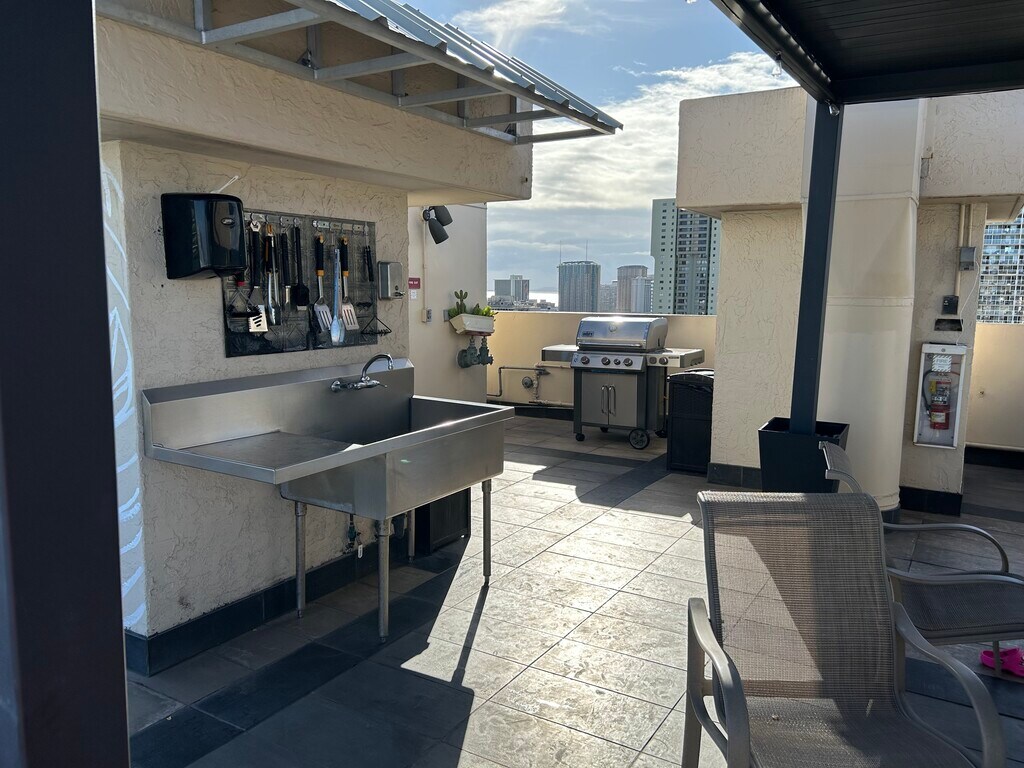 This remodeled studio apartment at 2345 Ala Wai Blvd offers 441 square feet of living space, featuring one bathroom with a murphy bed. The remodeled unit includes essential amenities such as air conditioning, a washer/dryer, and a microwave. Residents can enjoy access to a pool, sauna, and grill area, enhancing the outdoor living experience. The building is smoke-free with 24 hour security and gated, providing a secure environment. The living area is complemented by vinyl flooring and ceiling fan for comfort. The bathroom is efficiently designed for convenience. The exterior features a deck for relaxation and socializing. Great location - near International Marketplace, Waikiki Target, and Waikiki Beach. Please call and leave message. Thank you.