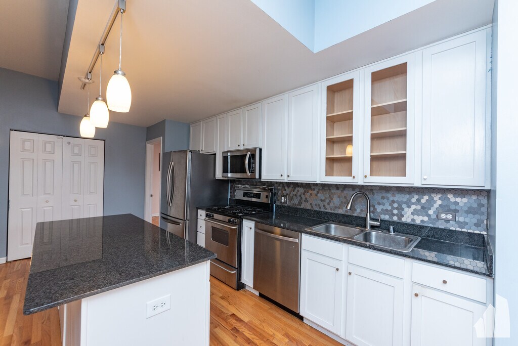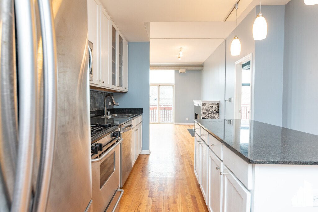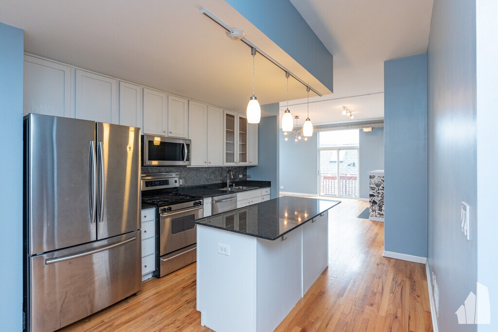 Sunny Wicker Park 3 bed 2 bath corner apartment on the top floor with north East windows. Spacious living area, in-unit laundry, skyline view, patio, and hardwood floors. All three bedrooms can fit a queen size bed or bigger. Ample closet space. Unit features a charming open kitchen with eat-in island for additional seating, stainless steel appliances, dishwasher, microwave, granite countertops, and garbage disposal. Apartment includes 1 indoor parking spot. Unit is in close proximity of grocery stores, transportation, retail, and entertainment including Target, Home Depot, Chick-fil-A, Xsport and Chipotle. This beautiful space truly has it all!!". Cats and dogs welcome with an additional fee. Mandatory Resident Benefit Package additional $40.00 per month; includes renters insurance, positive credit reporting for on-time rental payments, identity fraud protection and more. Presented by Fulton Grace Realty, Chicago, IL