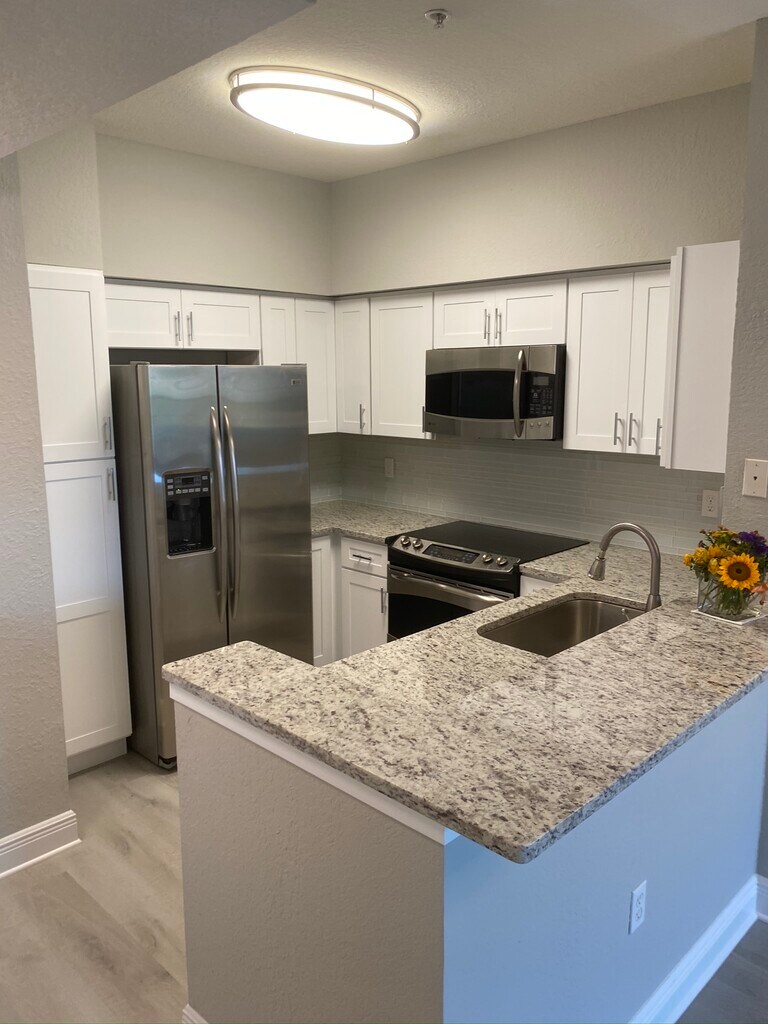 BEST LOCATION IN ESTERO, FL close to the beautiful beaches in SWFL between Naples and Fort Myers and across the street from the incredible Coconut Point Mall with restaurants, shops and more. Amenities include resort pool, fitness center, clubhouse, volleyball, pickle ball, and basketball court. Top floor corner residence is priavte on three sides with 3 bedroom and 2 baths. MODERN. Luxury vinyl wood floor everywhere (bedrooms and closets too)-- light grey. Kitchen with white shaker cabinet with soft close drawers and doors, chrome hardware, glass backsplash, granite counter tops, GE PROFILE STAINLESS STEEL appliances. Full sized WASHER AND DRYER in home. Baths and showers with modern tile in both baths, new toilets, new cabinets in grey, new mirrors, new tile floors, new glass shower enclosures. New fixtures. LED lighting throughout. This home is incredible is available to rent now. Call, text or email for an appointment. Local responsive and respectful owner. Don't miss out on this awesome location. Please note pet policy is Emotional support animal or Service animal only - allowed with proper documentation. This apartment is on the third floor. No elevator. Only one common wall, no one above or to the side of you. Super private!
