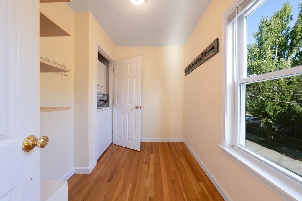 Fantastic location on a quiet, leafy street near Magoun Square. This sunny and meticulously maintained unit boasts many desirable features including hardwood throughout, stainless steel appliances and granite countertops in the kitchen, an in-unit washer dryer, central AC and a private entrance in addition to the shared entrance. Two tandem parking spaces included. There is also bonus space that could be used as a laundry room or small home office (off the living room) or mud room (off the kitchen).