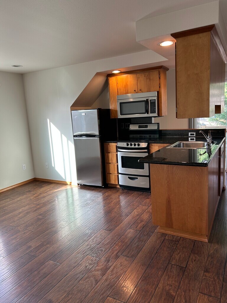 503 sq ft compact apartment in upper part of detached garage. One stall with garage door opener included. Small deck with lake view. Close to Pierce College, Ft Steilacoom Park and JBLM. Would like credit score to be at least 700 or better and income to be 3X the rent. We would consider a small dog or cat. No smoking. Tenant pays power and WiFi. Peaceful area. Gated yard.