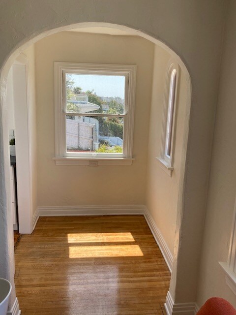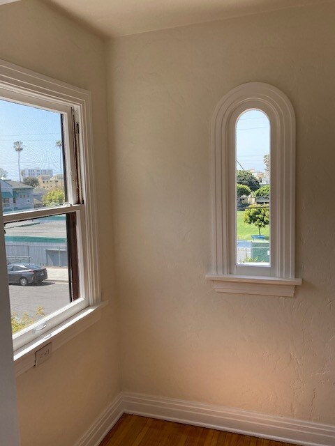 Beautiful large bright studio+, kitchen remodel featuring new stone countertops, cabinets, new appliances. Bathroom remodel featuring new tile, new bathtub and fixtures, new marble topped vanity, hardwood floors, walk-in closet, private outdoor patio, open garden area right outside your front door, wide open views of grassy park, palms trees and peak of the ocean. 1/2 mile to beach, restaurants, markets et c. Notes: No smoking in or around the property, renter pays all utilities for unit. Excellent credit and references are necessary. Free and abundant street parking available on 6th street.